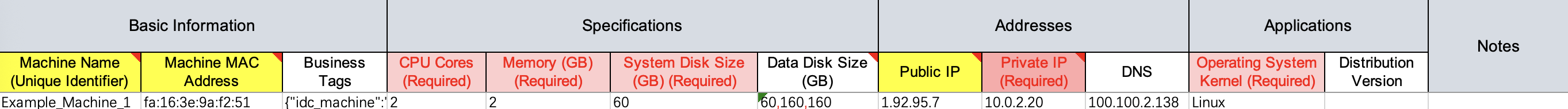 Fill in the file template according to the resource specification. The red columns are required items. Hover over cells with red indicators to view the corresponding filling instructions.