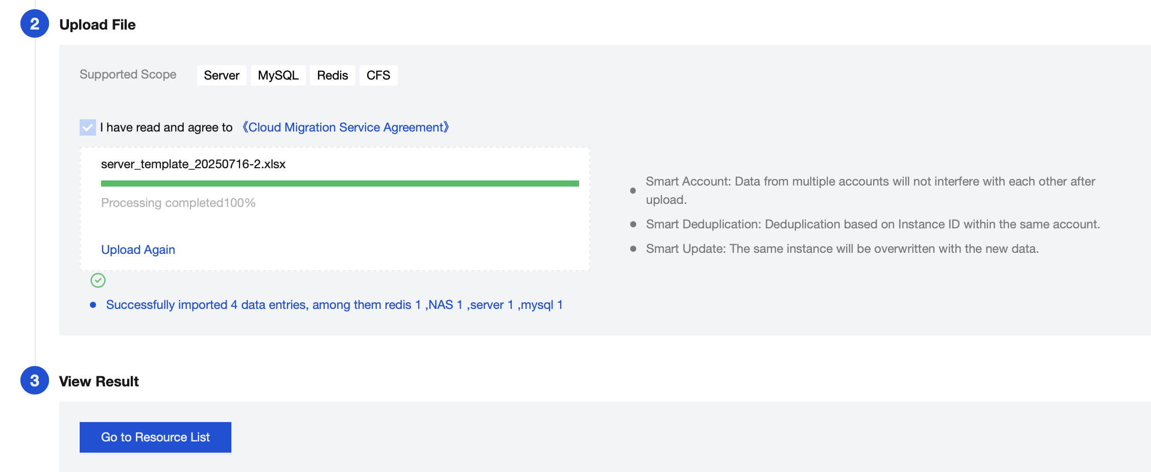 After completing, upload the file and complete parsing. Click Go to Resource List to view the imported data this time.