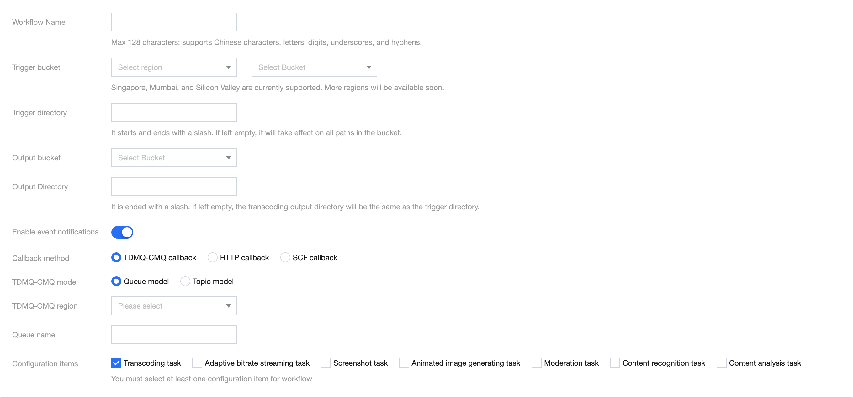 Event notifications | No | Disabled by default. For detailed instructions on how to configure event notifications, see callback configuration below. To enable TDMQ-CMQ event notifications, you need to activate Tencent Distributed Message Queue and create a model. After TDMQ-CMQ event notifications are enabled, the specified message queue will receive notifications about video processing events. |