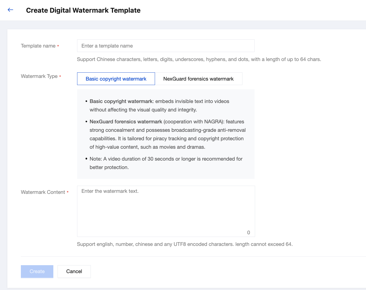 For "text watermark" | Watermark Content | Only alphanumeric characters and standard English symbols are permitted; the percent sign (%) is not supported, and the maximum length must not exceed 100 characters. |