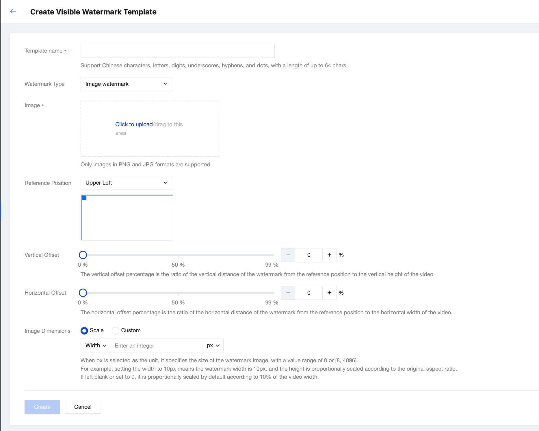 Reference position | Upper left (default), upper right, lower left, or lower right, based on which you can change the position of the watermark image by adjusting the vertical and horizontal offset | Upper left (default), upper right, lower left, or lower right, based on which you can change the position of the watermark image by adjusting the vertical and horizontal offset |