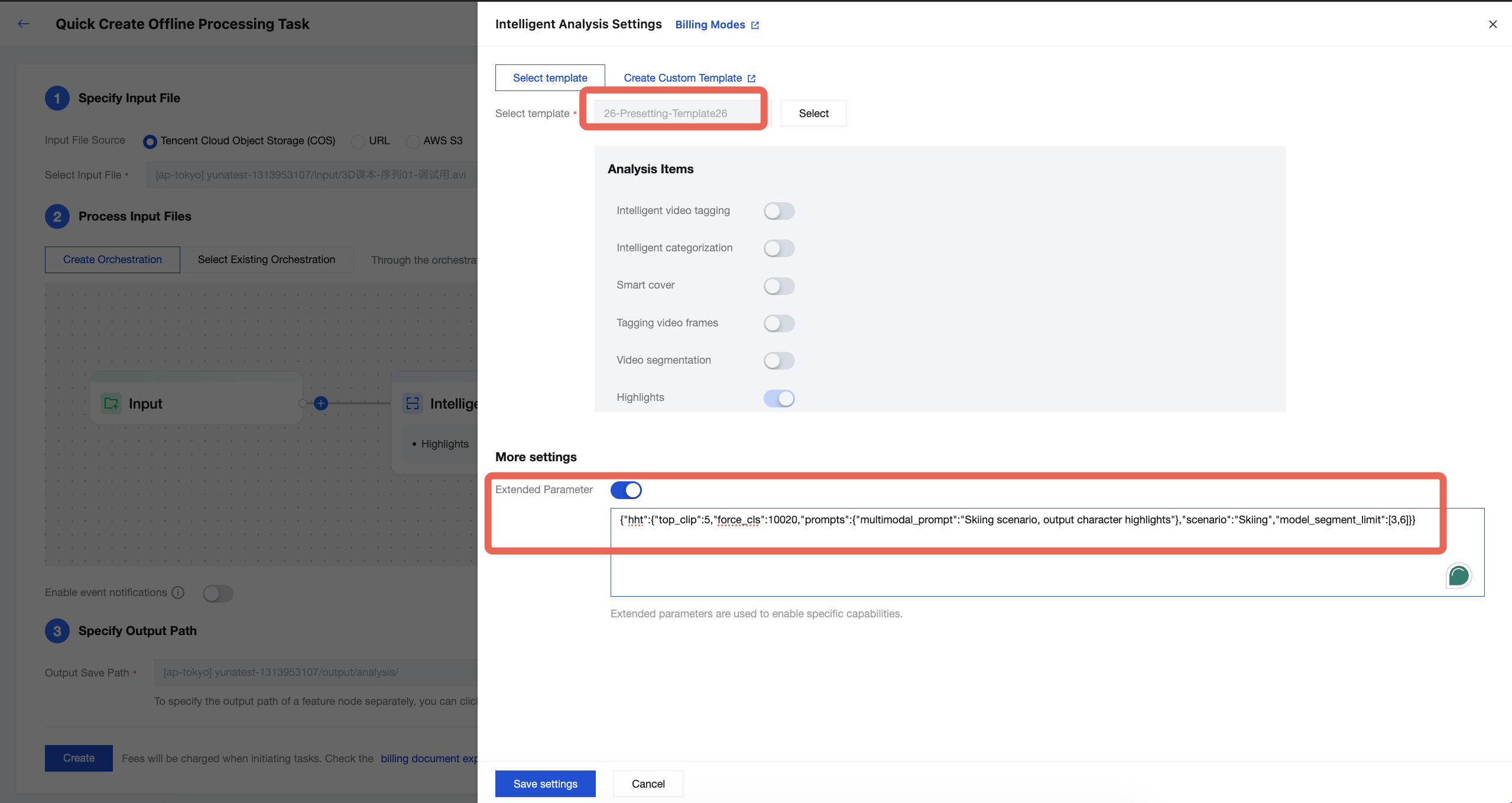 In the Intelligent Analysis Settings drawer that appears, select the Intelligent Highlights preset template (template ID: 26). You can enable Extended Parameters under More Settings and pass extended parameters as described in this documentation to specify a highlight scenario and achieve better highlights. 4. Finally, after specifying the output video storage path, click Create to initiate the task.