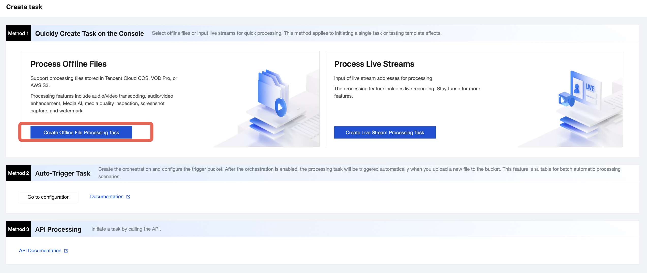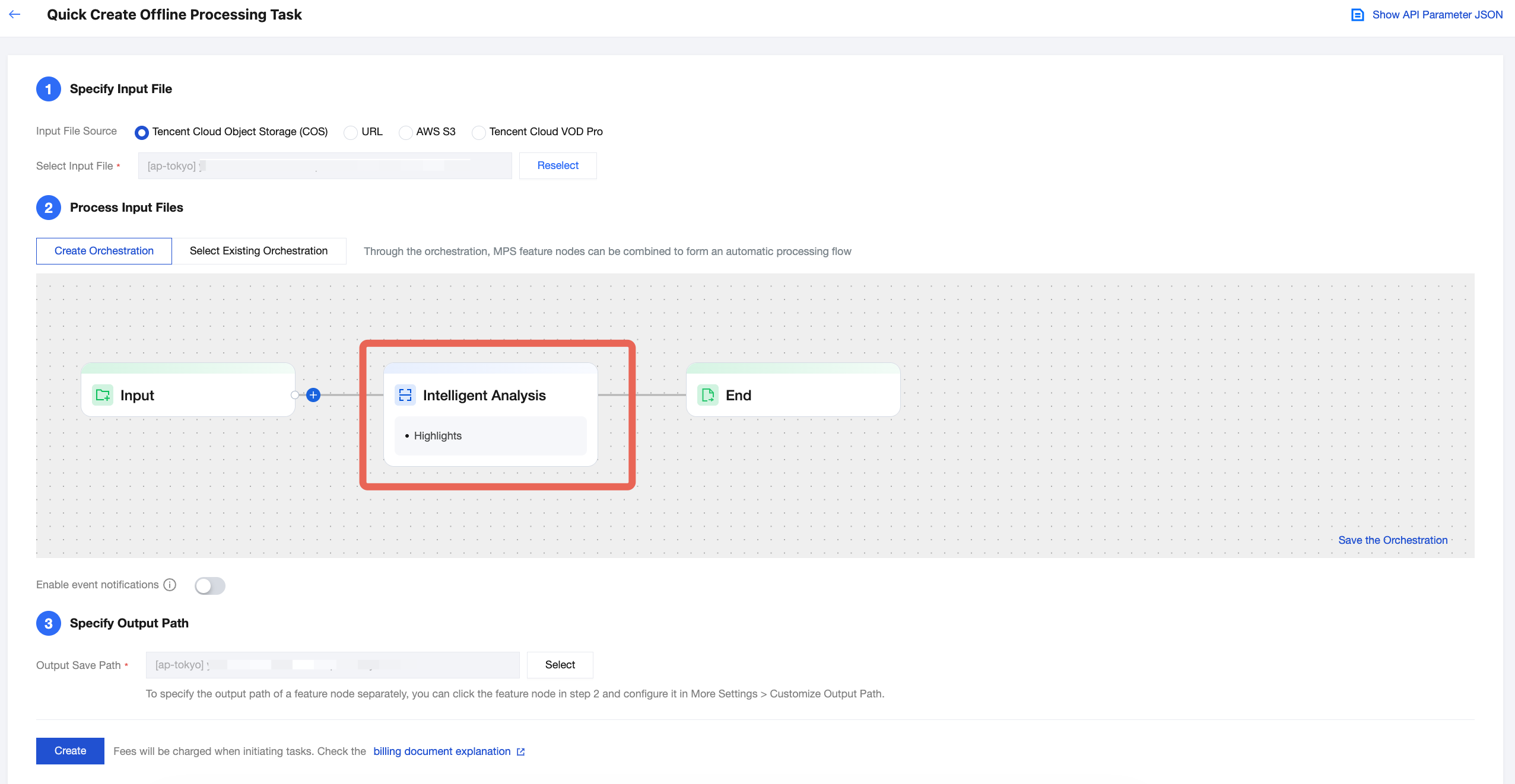 1. Go to the MPS console and click Create Task > Create Offline File Processing Task. 2. First, specify the input video file. The Intelligent Highlights feature currently does not support AWS S3 as an input source.