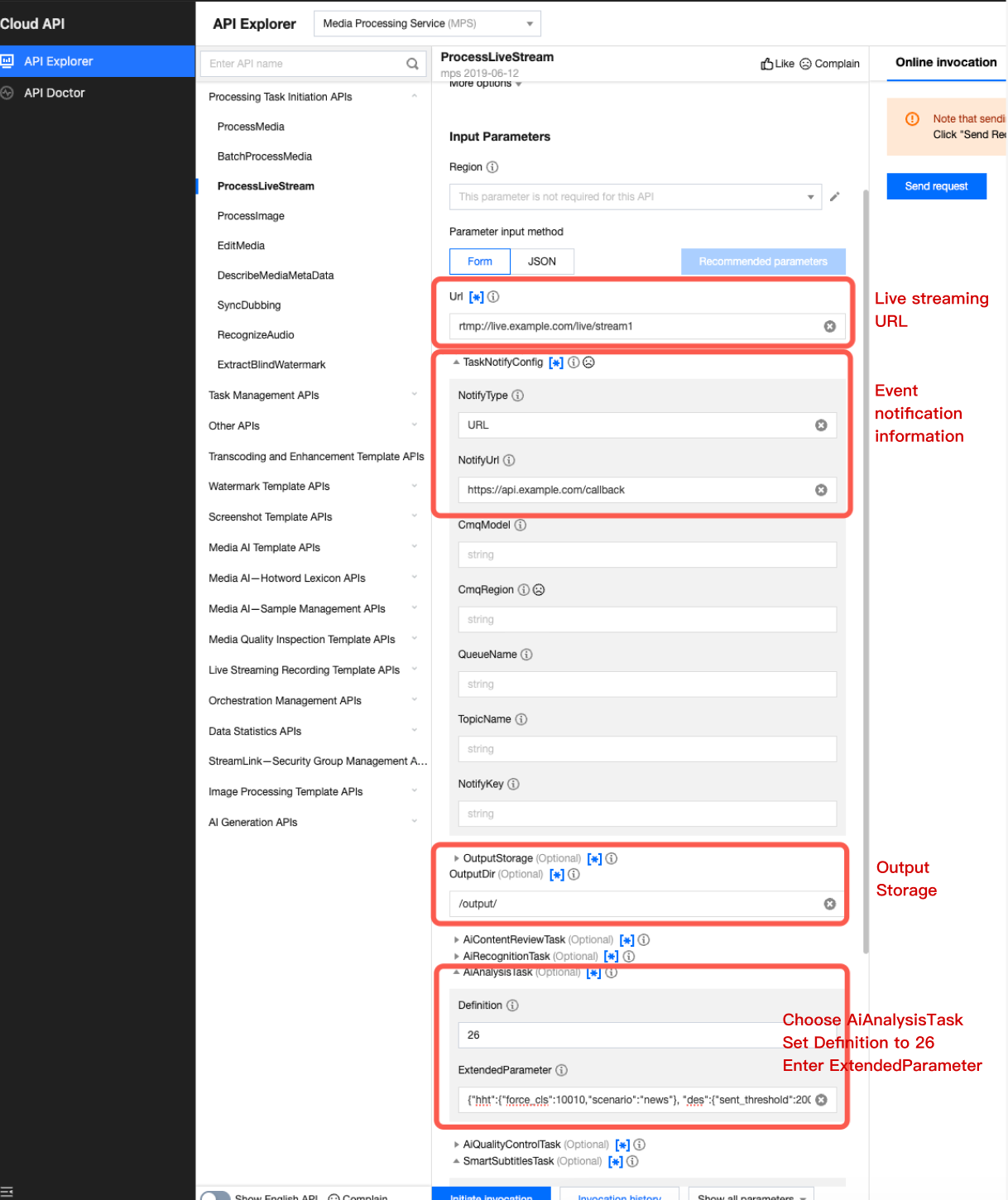 For details on calling an API to initiate a live stream processing task, see ProcessLiveStream. In the document, click API Explorer Debugging in the description to go to the page, fill in the required parameters, and initiate an online call. Initiating a Request via an API