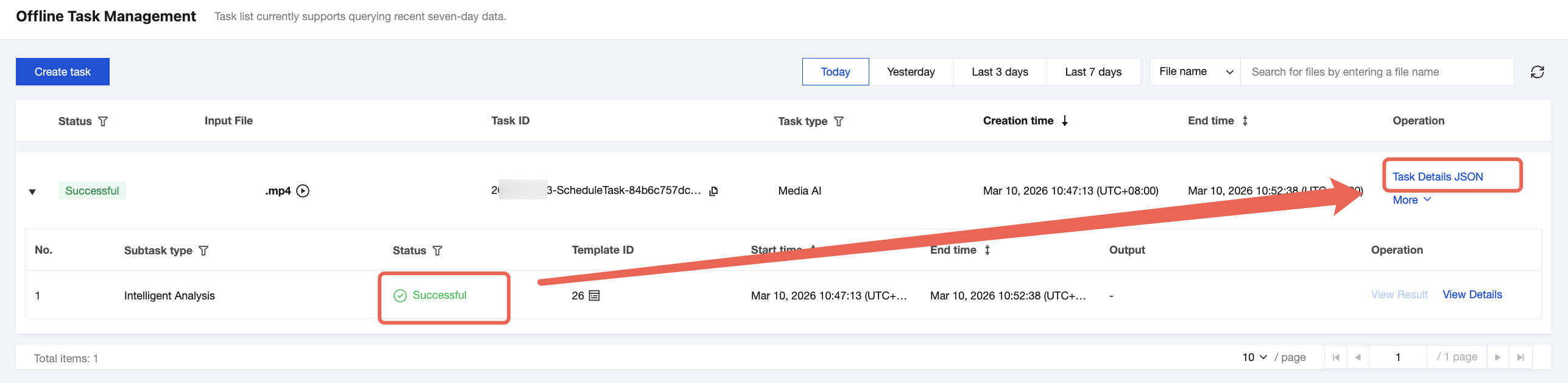 1. You can check the task status on the Task Management page in the console. When the subtask status is "Successful": 2. Click Task Details JSON to view the output result and output file path in the output message.