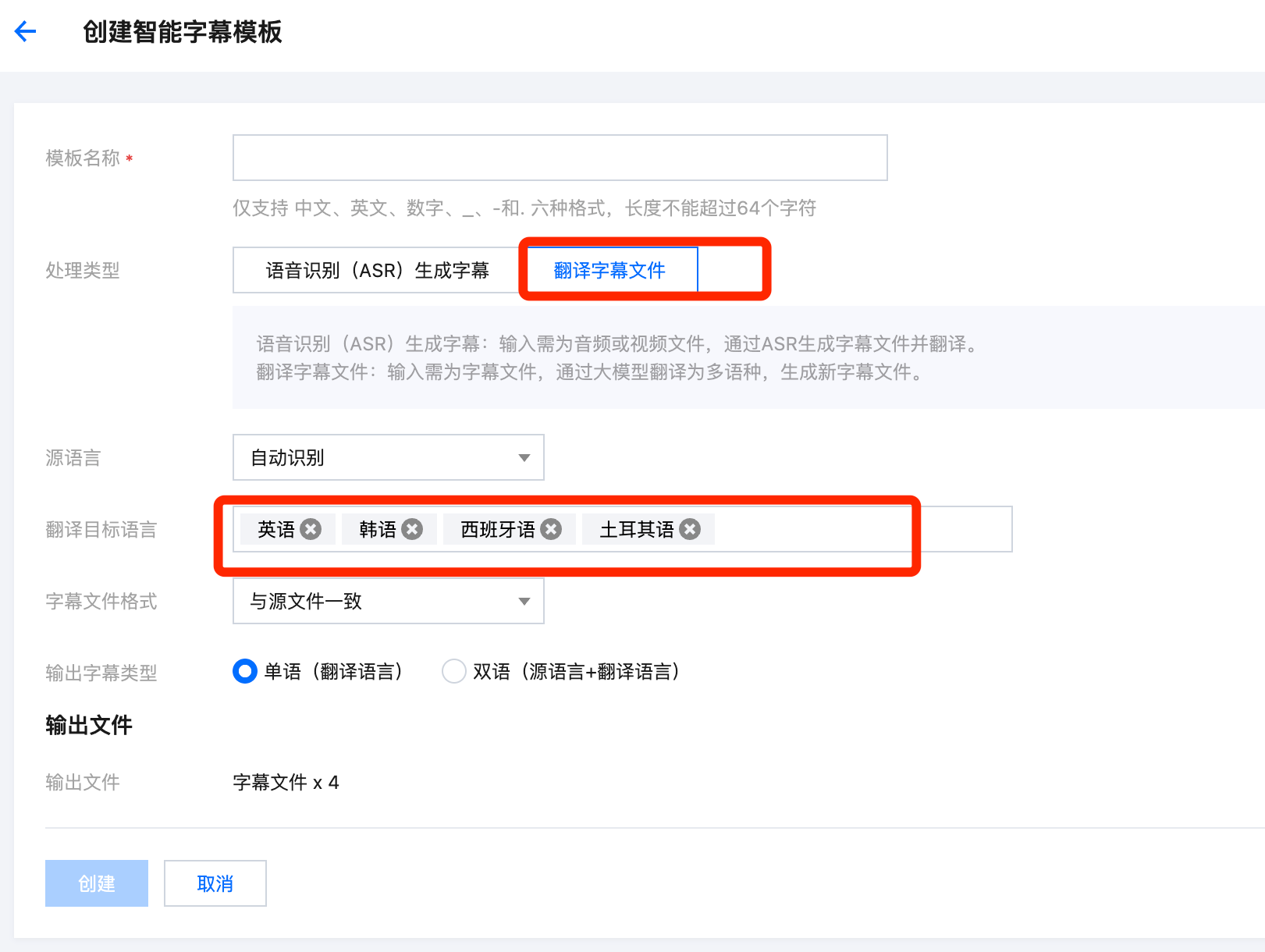 字幕类型 | 支持以下选项: 单语(翻译语言):生成的翻译语言字幕文件为单行单语字幕。 双语(源语言 + 翻译语言):生成的翻译语言字幕文件为双行双语字幕。 | |