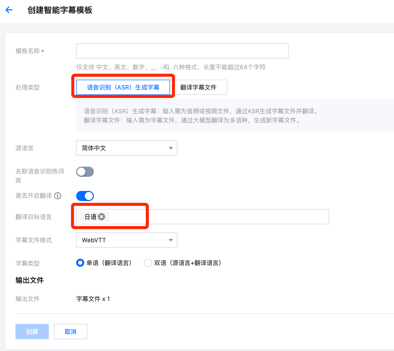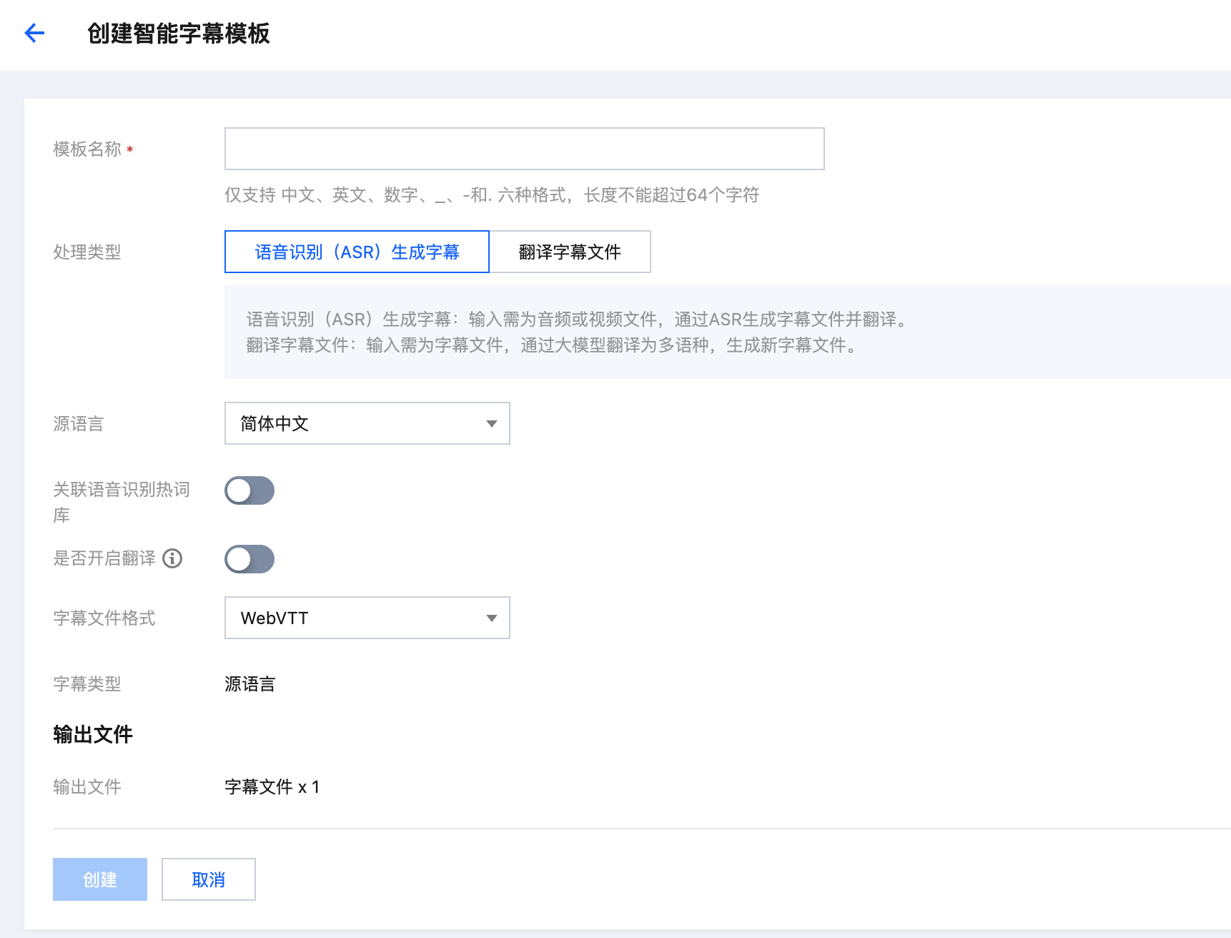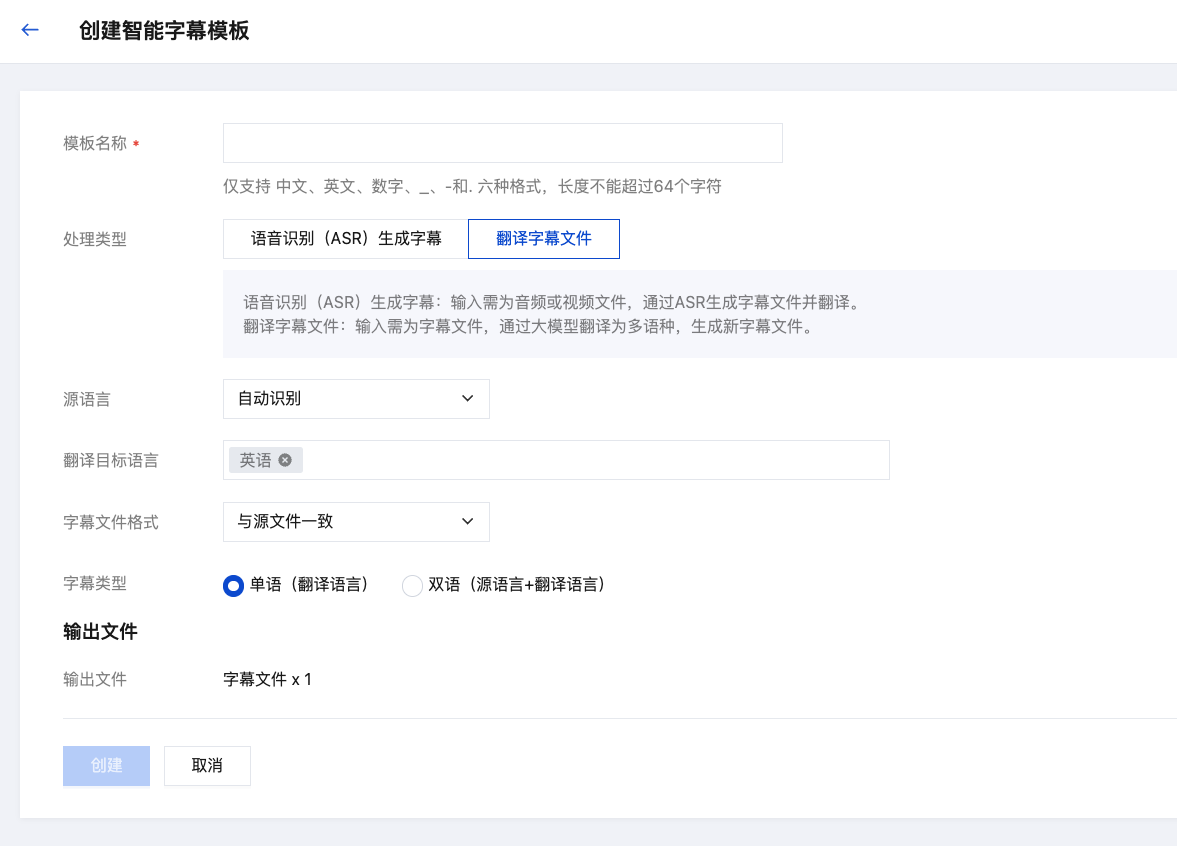 处理类型 | | 语音识别(ASR)生成字幕:输入需为音频或视频文件,通过ASR生成字幕文件并翻译。 翻译字幕文件:输入需为字幕文件,通过大模型翻译为多语种,生成新字幕文件。 |