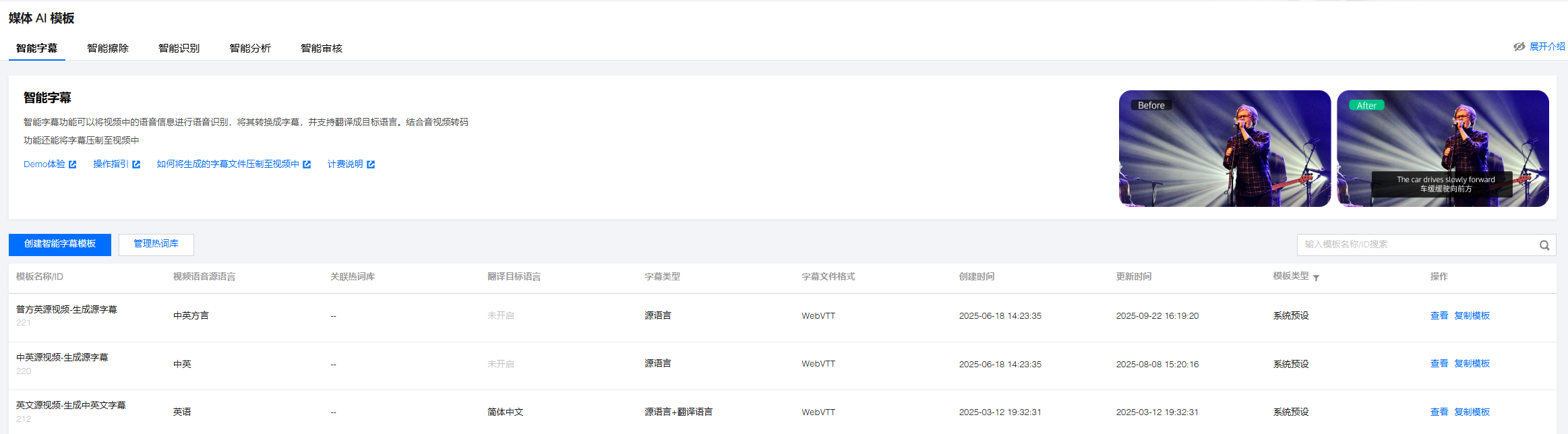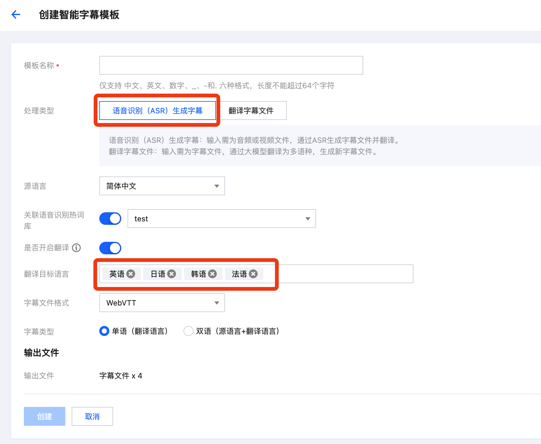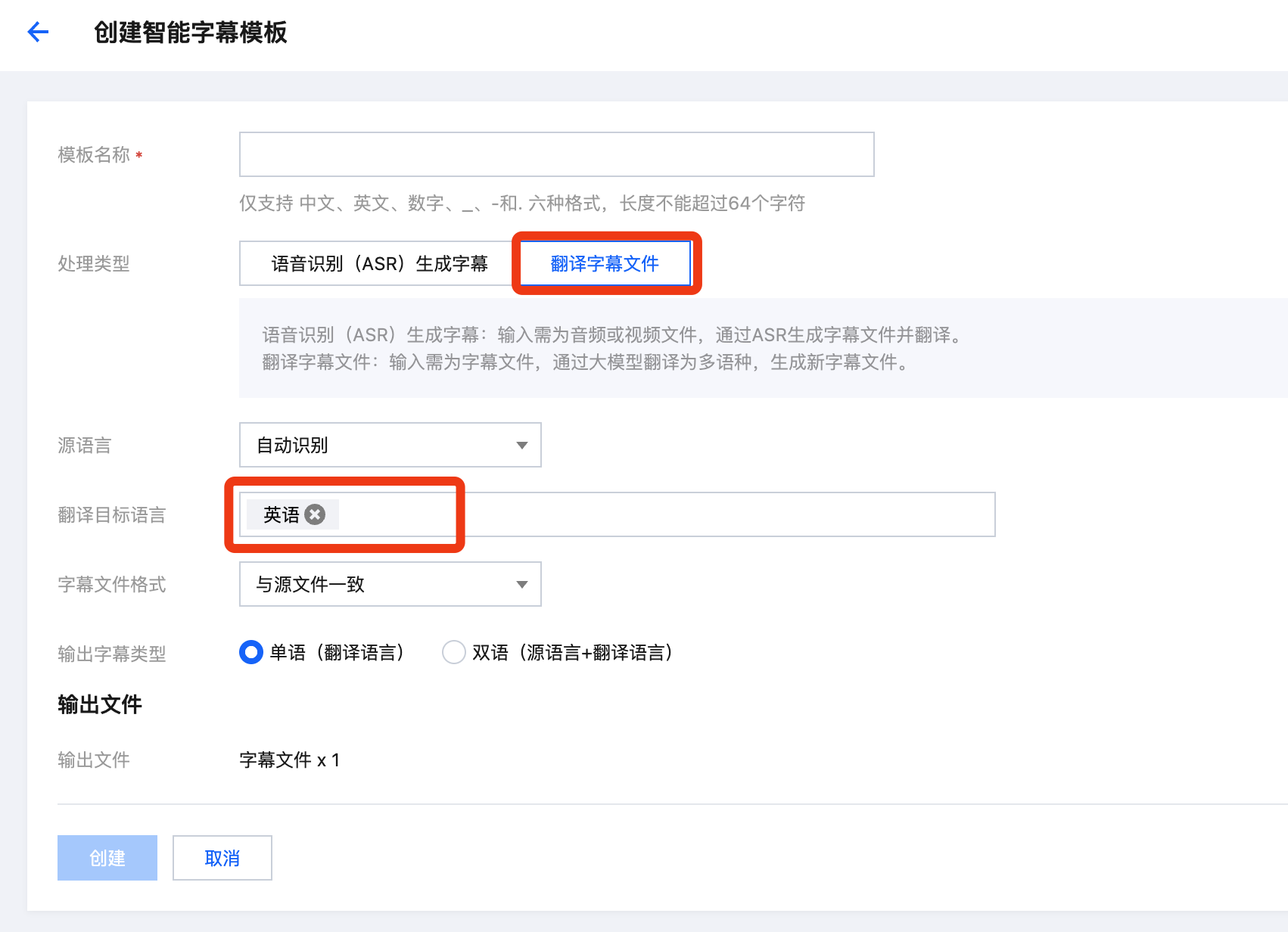 处理类型 | | 语音识别(ASR)生成字幕:输入需为音频或视频文件,通过ASR生成字幕文件并翻译。 翻译字幕文件:输入需为字幕文件,通过大模型翻译为多语种,生成新字幕文件。 |