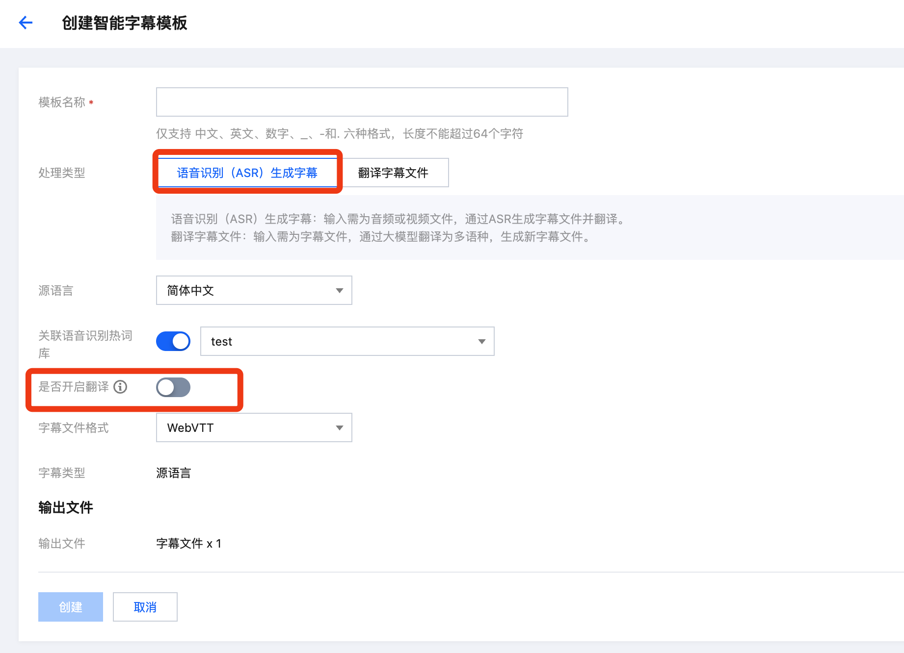 是否开启翻译 | 开启后,支持将源语言字幕翻译成指定语言,适用于视频转译出海等场景。 说明: | |