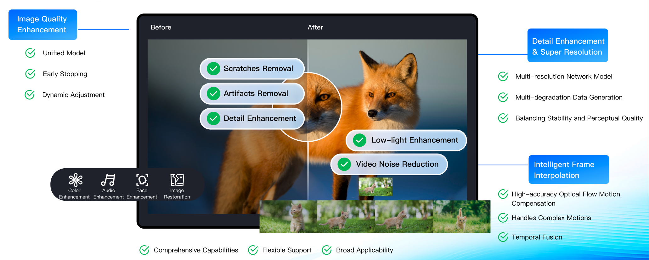 Audio/video enhancement includes features such as video artifacts removal, denoising, color enhancement, detail enhancement, face enhancement, and SDR2HDR. If you are still not satisfied with the results of the combination tests by yourself, directly contact us to obtain detailed configuration recommendations and perform advanced parameter tuning.