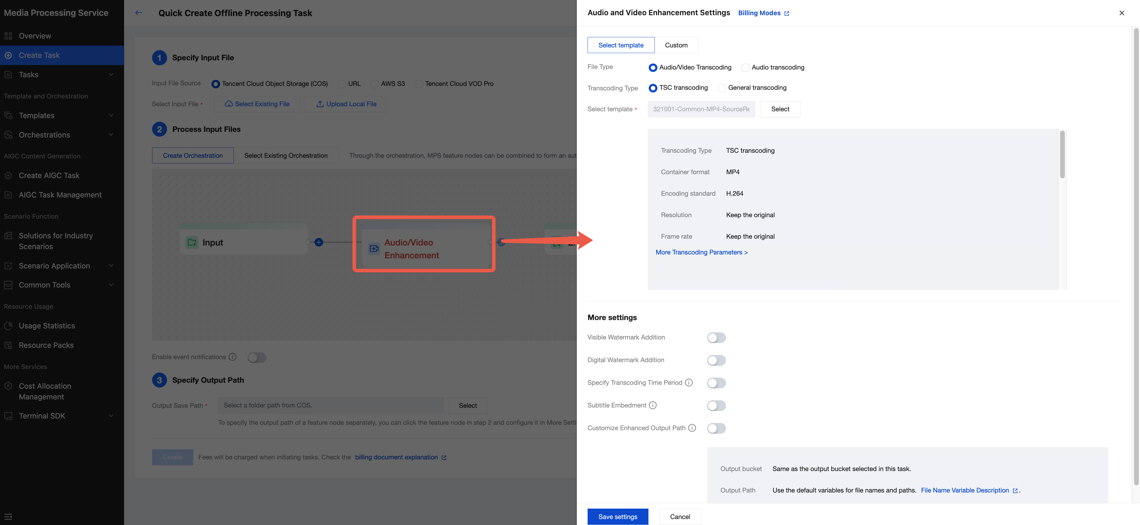 1. Enter the MPS console Create Task webpage, select the "audio and video enhancement" node, and choose an enhancement template from the pop-up interface on the right. You can choose a preset template or custom template. For detailed configuration guide, refer to audio/video enhancement template. 2. Specify the input file path and output path, then click "Create" to initiate the task.