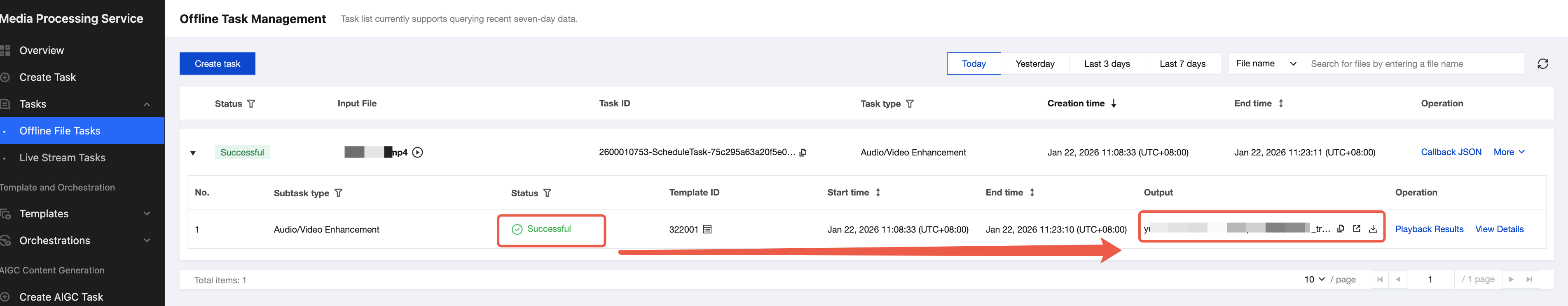 When the subtask status is "successful", you can preview, download, or navigate to the corresponding COS Bucket directory for the output file.