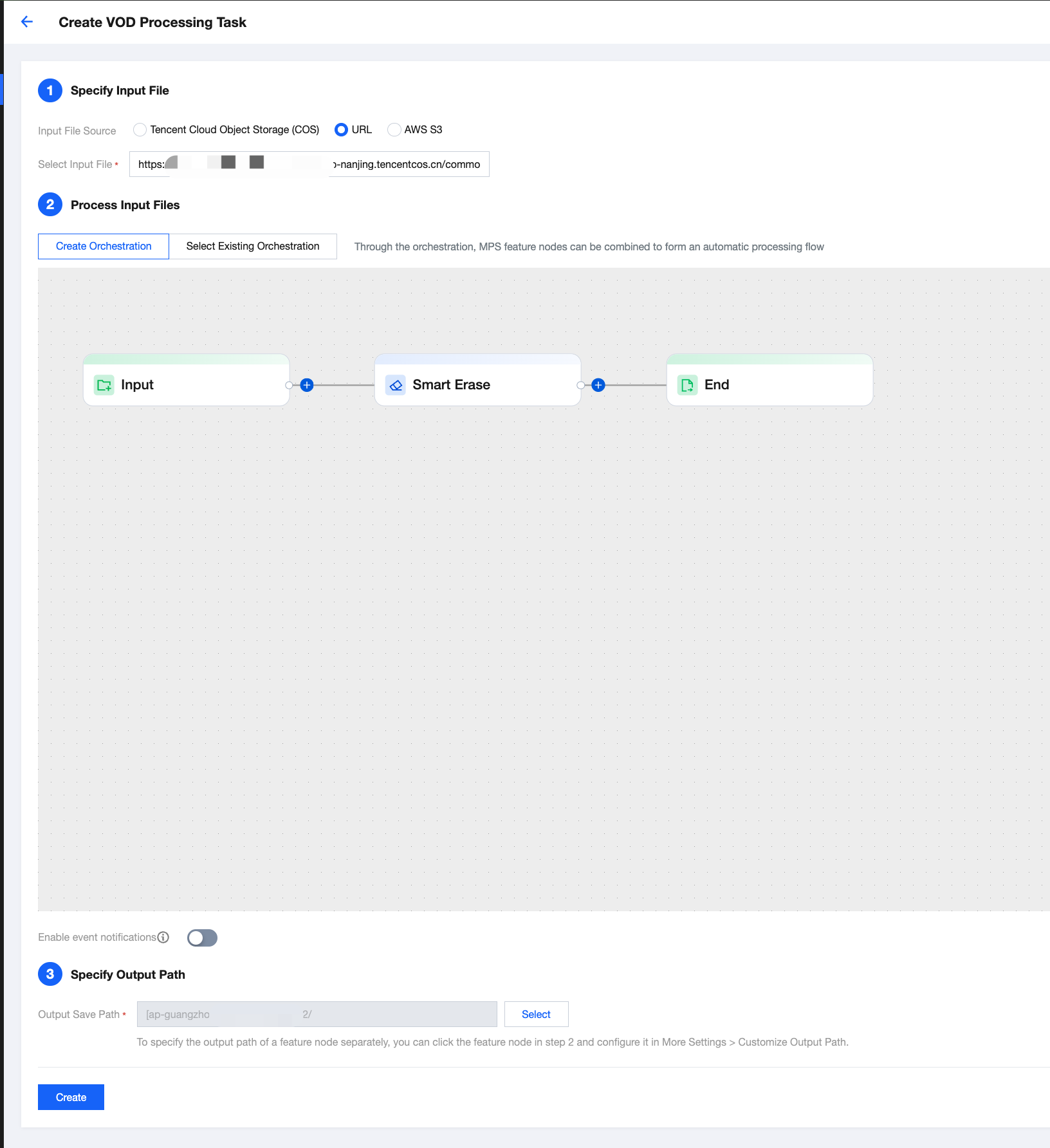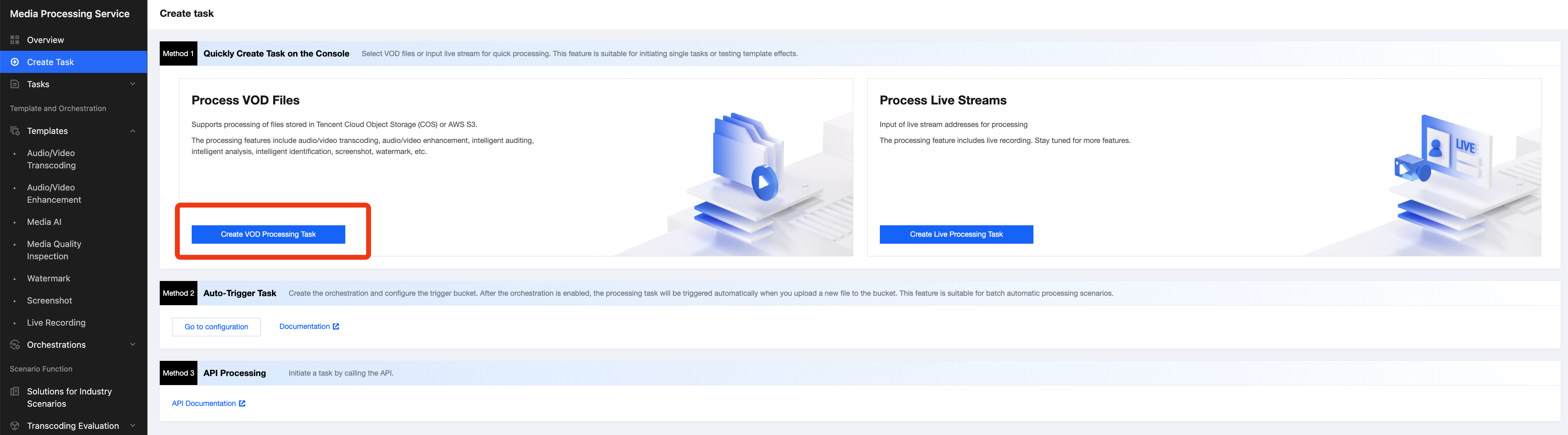 1. Go to the Create Task page of the console, and click Quickly Create VOD Processing Task. 2. Configure the input file path, task processing workflow, and output path sequentially.