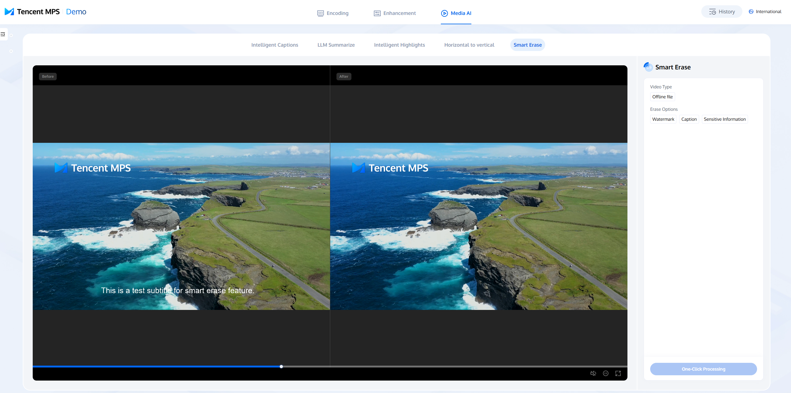 Open Experience Hall to go to the Smart Erase experience page. Select a file and erasing type on the right, and click One-Click Processing. Wait for processing to complete and view the result. Note: