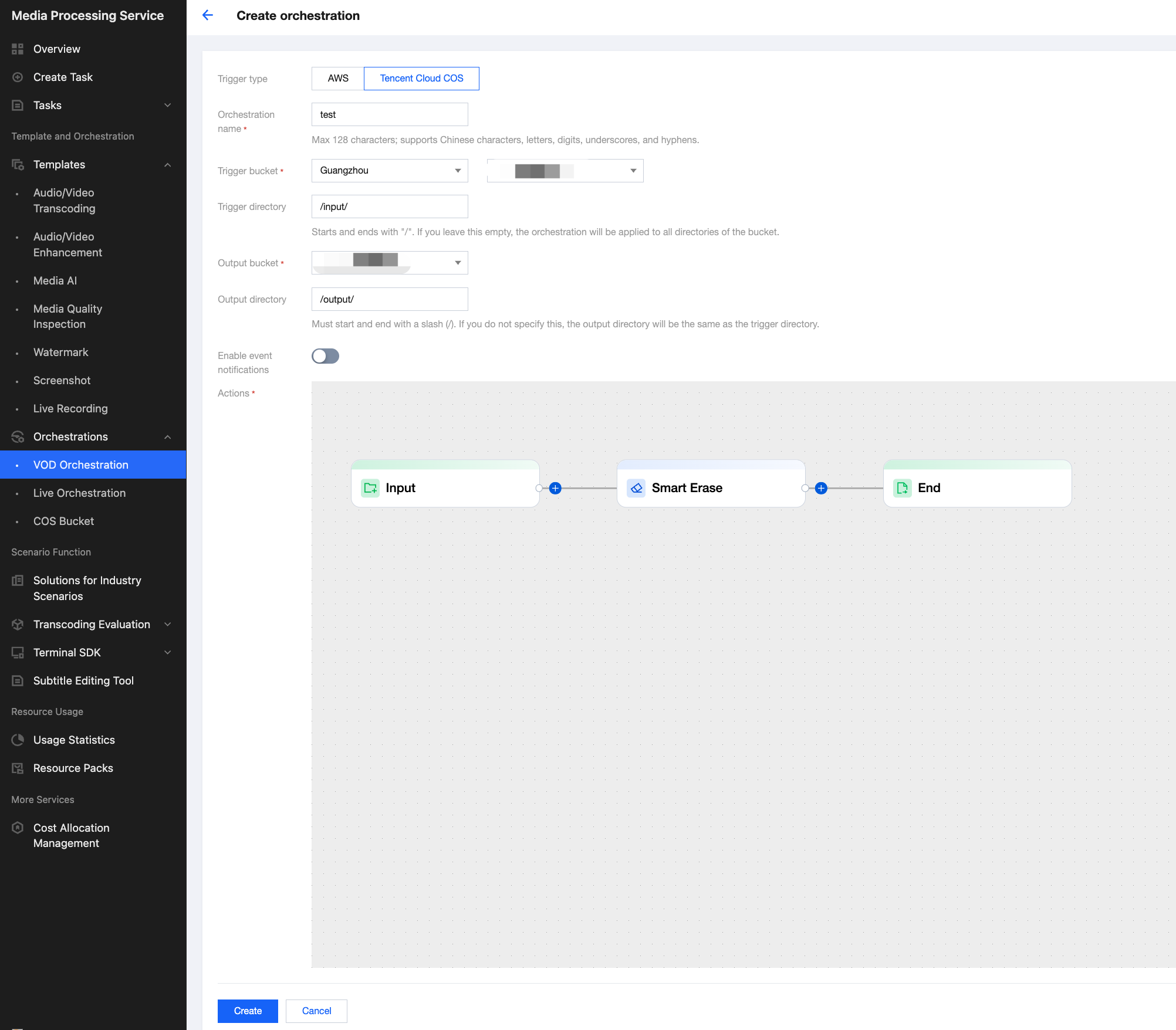 1. Go to the VOD Orchestration page of the console and click Create Video on Demand Service Orchestration. 2. Configure the trigger directory, output directory, and task configuration on the page to create the orchestration.