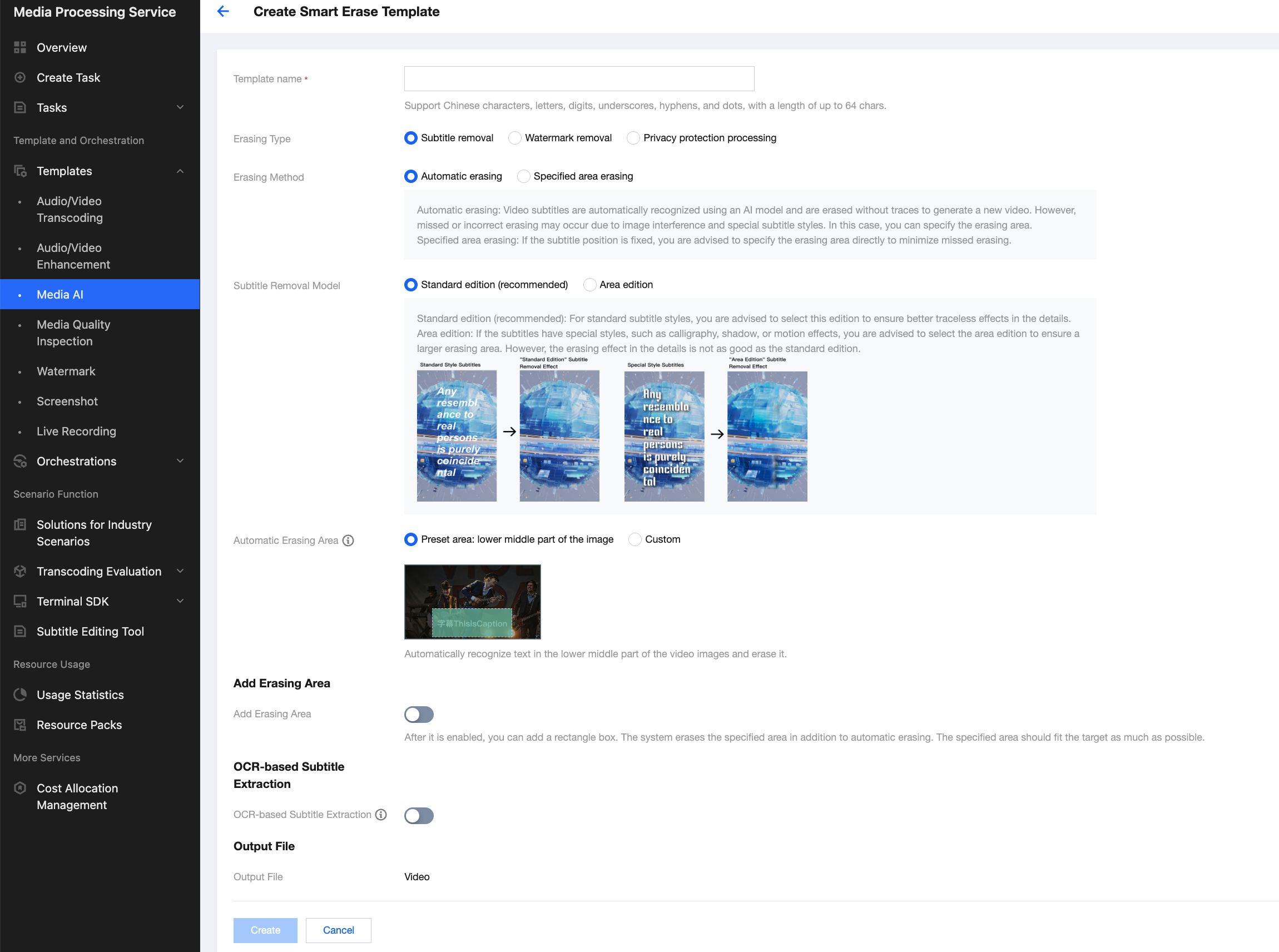 Go to the Smart Erase Template page in the console. For parameter descriptions, see Smart Erase Template. To facilitate understanding, the following sections provide template configuration examples categorized by feature and use case. Subtitle Removal