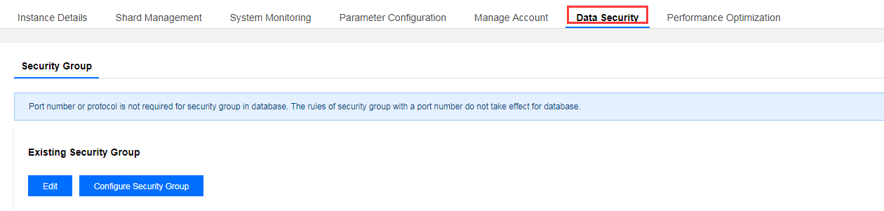 Log in to the TDSQL for MySQL console, click an instance ID in the instance list to enter the management page, and select Data Security > Security Group to manage security groups. Note: