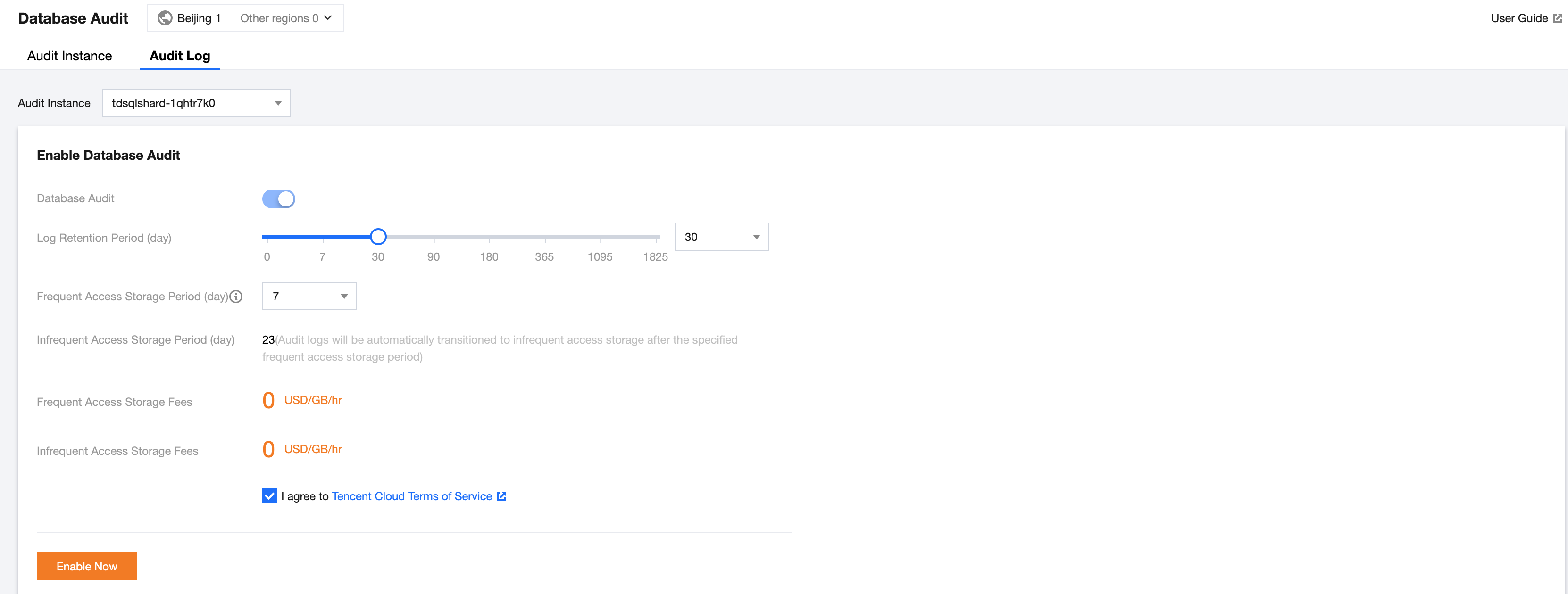 2. On the Audit Instance tab, click the ID of the target instance to enter the enablement page, indicate your consent to the agreement, and click Enable Now.