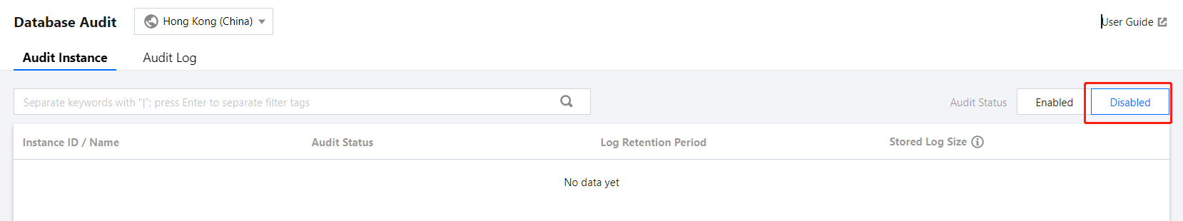 Alternatively, in Audit Instance on the Audit Log tab, directly search for audit-disabled instances and then enable audit for them.