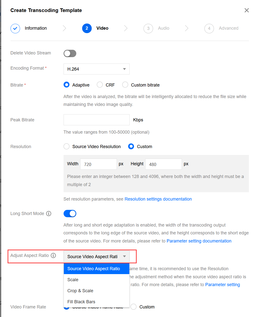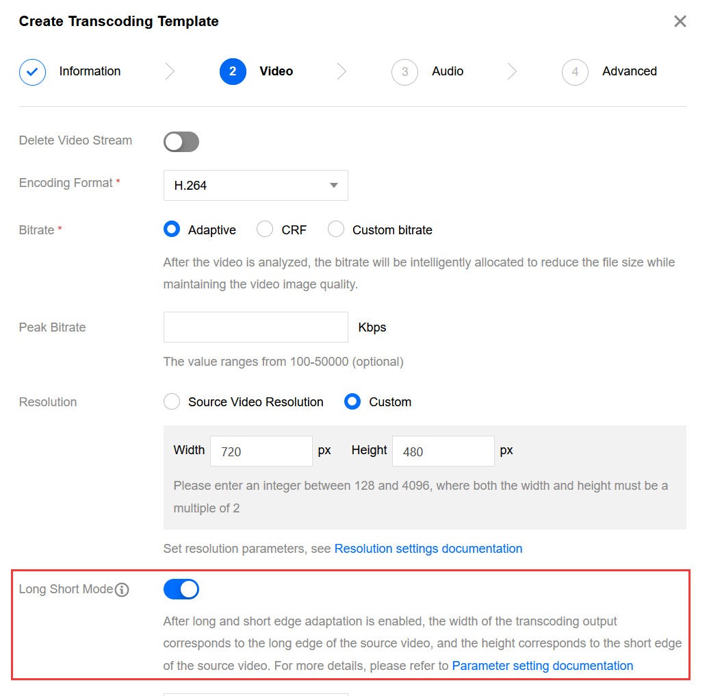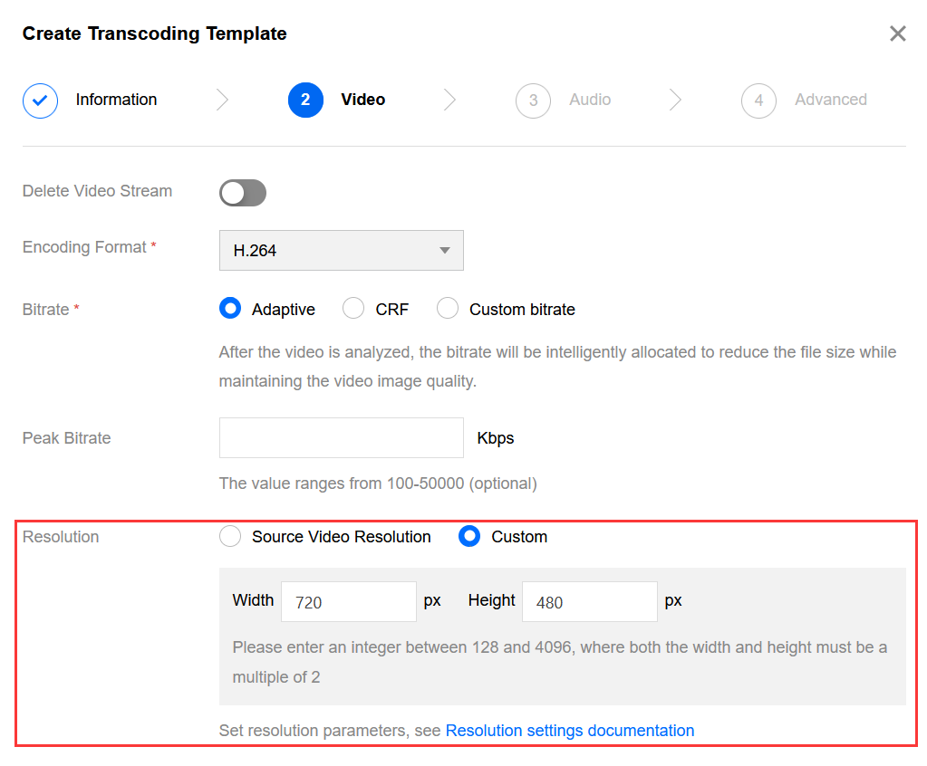Step four is optional: This step is only required when both the width and height of the specified resolution are not empty (transcoding according to the specified width and height).