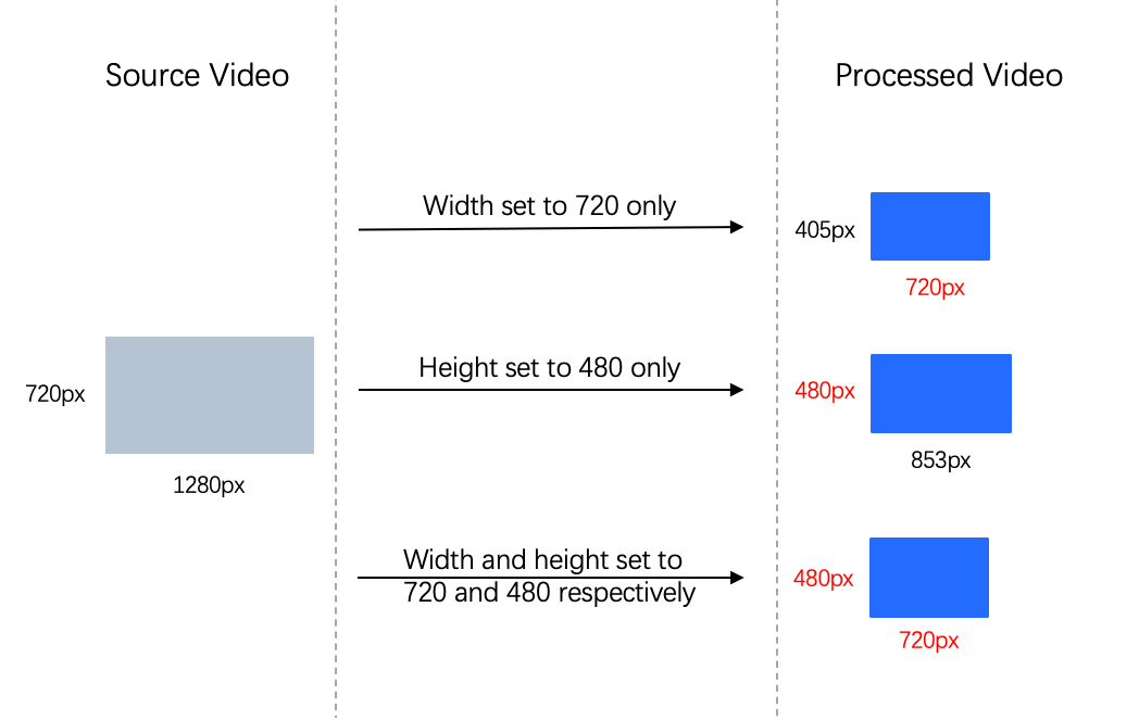 Height: Video.Height | When both width and height are empty, the resolution of the source video is adopted. If you do not want to change the original video resolution, use this setting. If one side is empty, the other side is proportionally scaled according to the source video resolution. If the dimensions of the input videos vary and you do not want to change the original aspect ratio, use this setting. When both width and height are not empty, transcoding is performed according to the specified width and height. If you need to constrain the video to a fixed width and height, use this setting. |