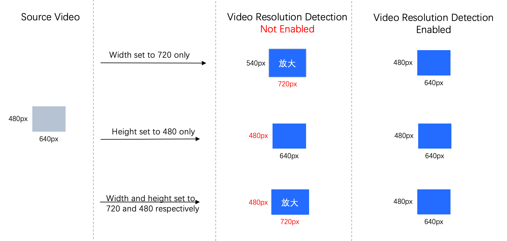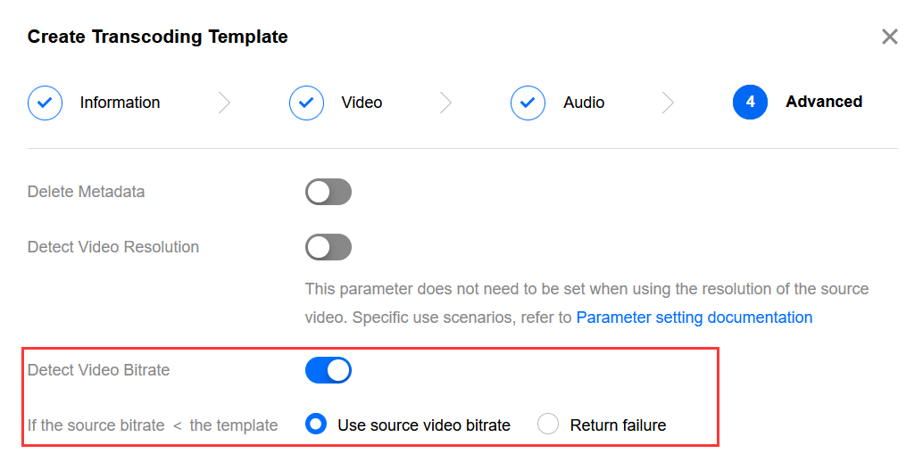 When the source video resolution is detected to be lower than the target resolution, you can choose either to Use source video resolution or Return failure, to avoid stretching low-resolution videos. The setup of video resolution is as follows: