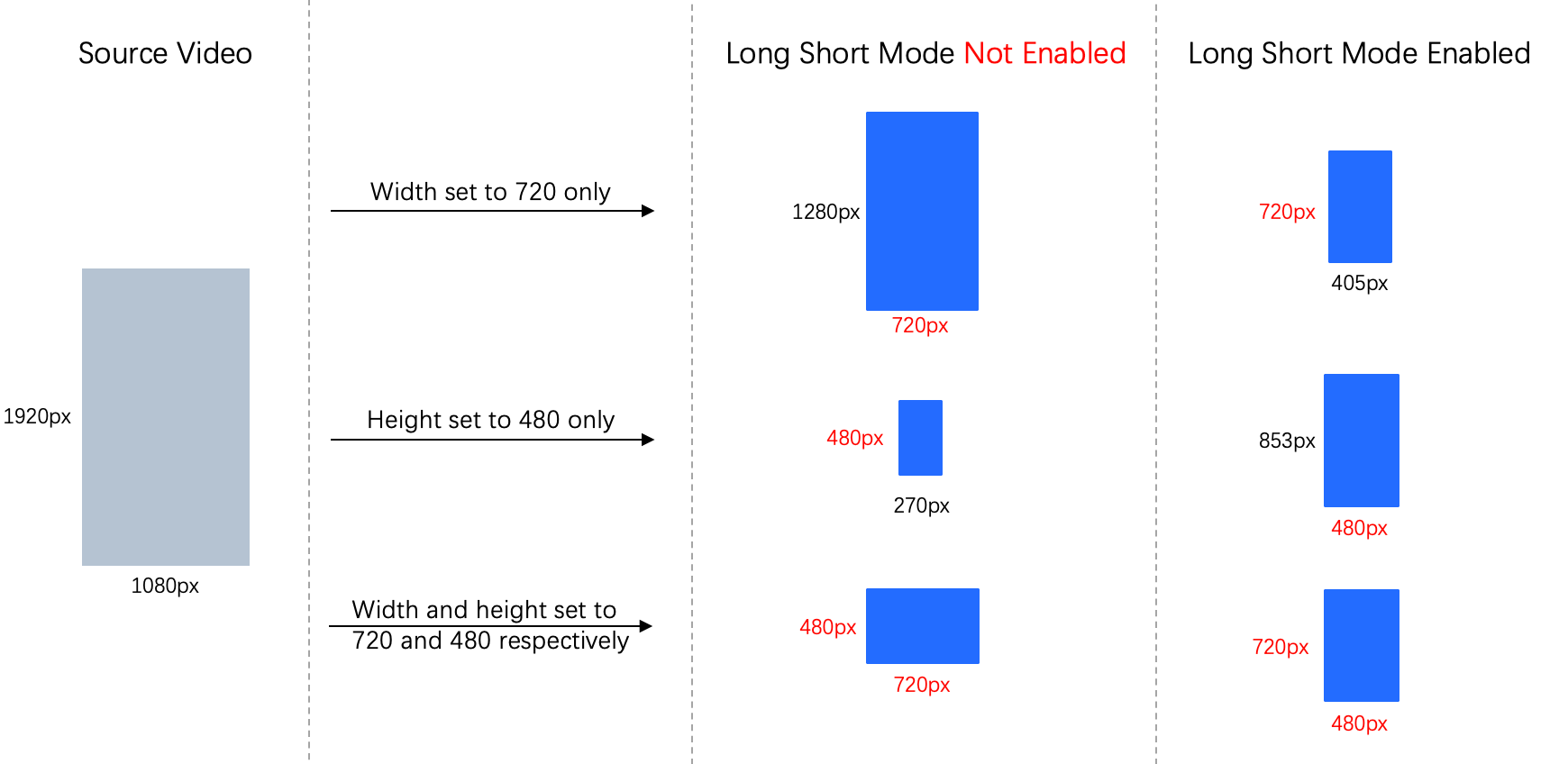 Video.LongShortMode | If it is enabled, the length of the corresponding input video will be automatically identified as the width, and the shorter side as the height. |