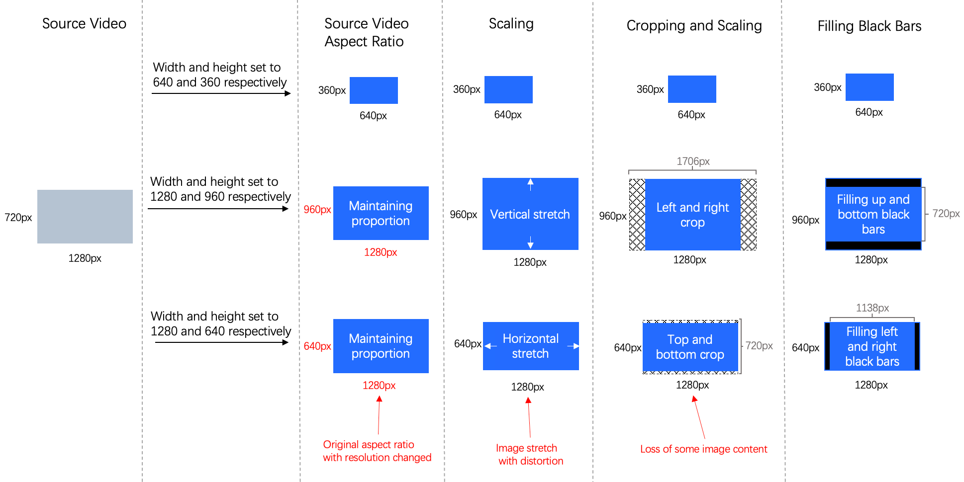 When both width and height are set, it is recommended that you use resolution adjustment parameters to specify the adjustment method if the aspect ratio of the source video is different from the specified one. The following details the parameters of resolution adjustment method: