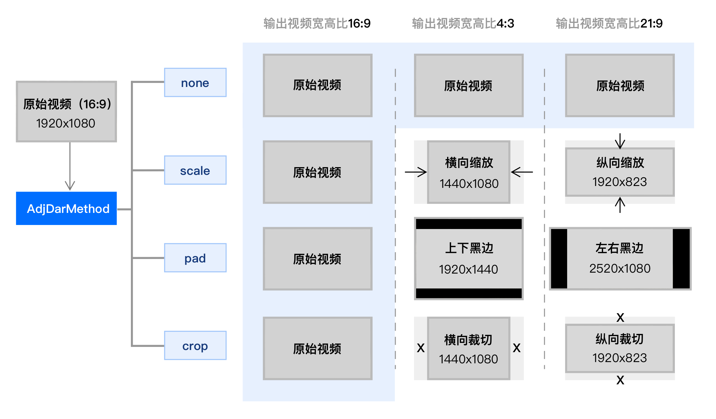 AdjDarMethod | Request.TransConfig | Resolution adjustment method value is scale, crop, pad, none When the aspect ratio of the output video differs from that of the original video, adjust the resolution according to this parameter. | String | none | No |