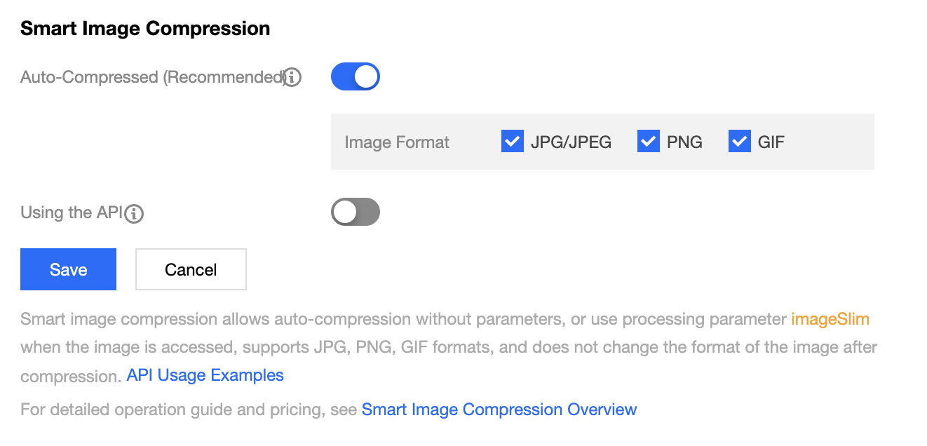 Automatic Compression (Recommended): Enables the automatic usage of Intelligent Compression. Once enabled, images in the specified format within the Bucket will be intelligently compressed upon access without carrying any parameters.