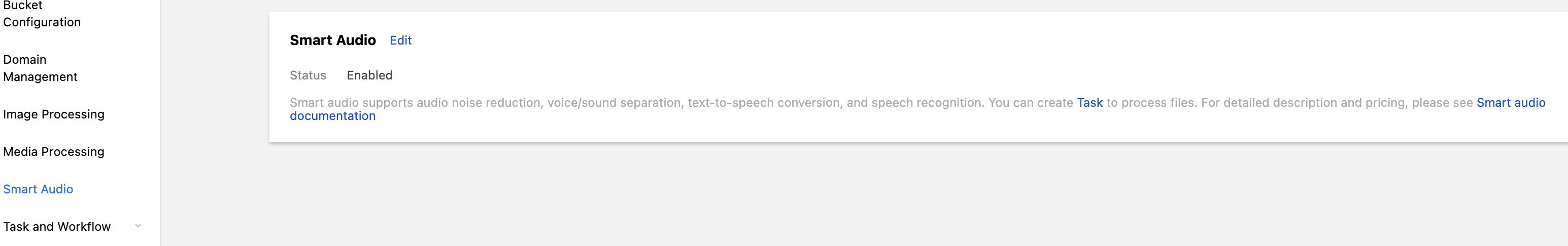 Using the intelligent voice feature requires activating the Cloud Infinite service. The incurred fees will be charged by the Cloud Infinite service. For detailed billing information, see Cloud Infinite Smart Audio Billing. When using the intelligent voice service, please first confirm the relevant limitations and Region. For details, see Usage Limitations. You can create workflow or task to perform corresponding file processing operations. Feature Experience