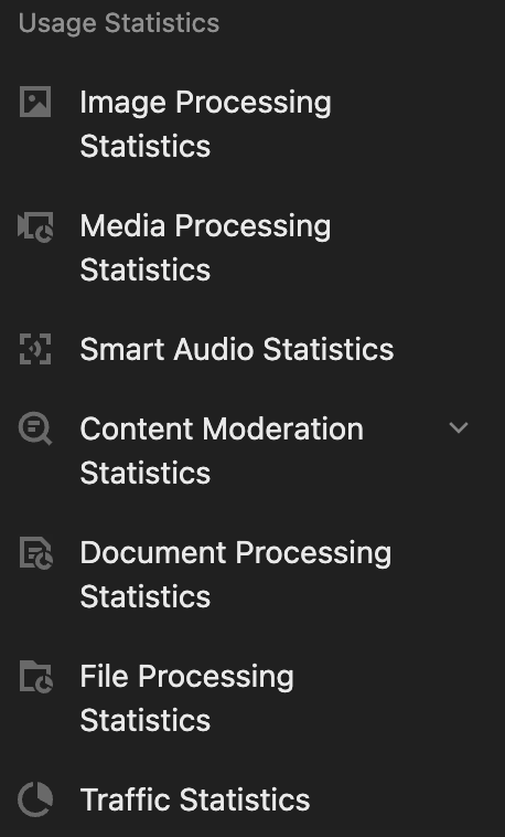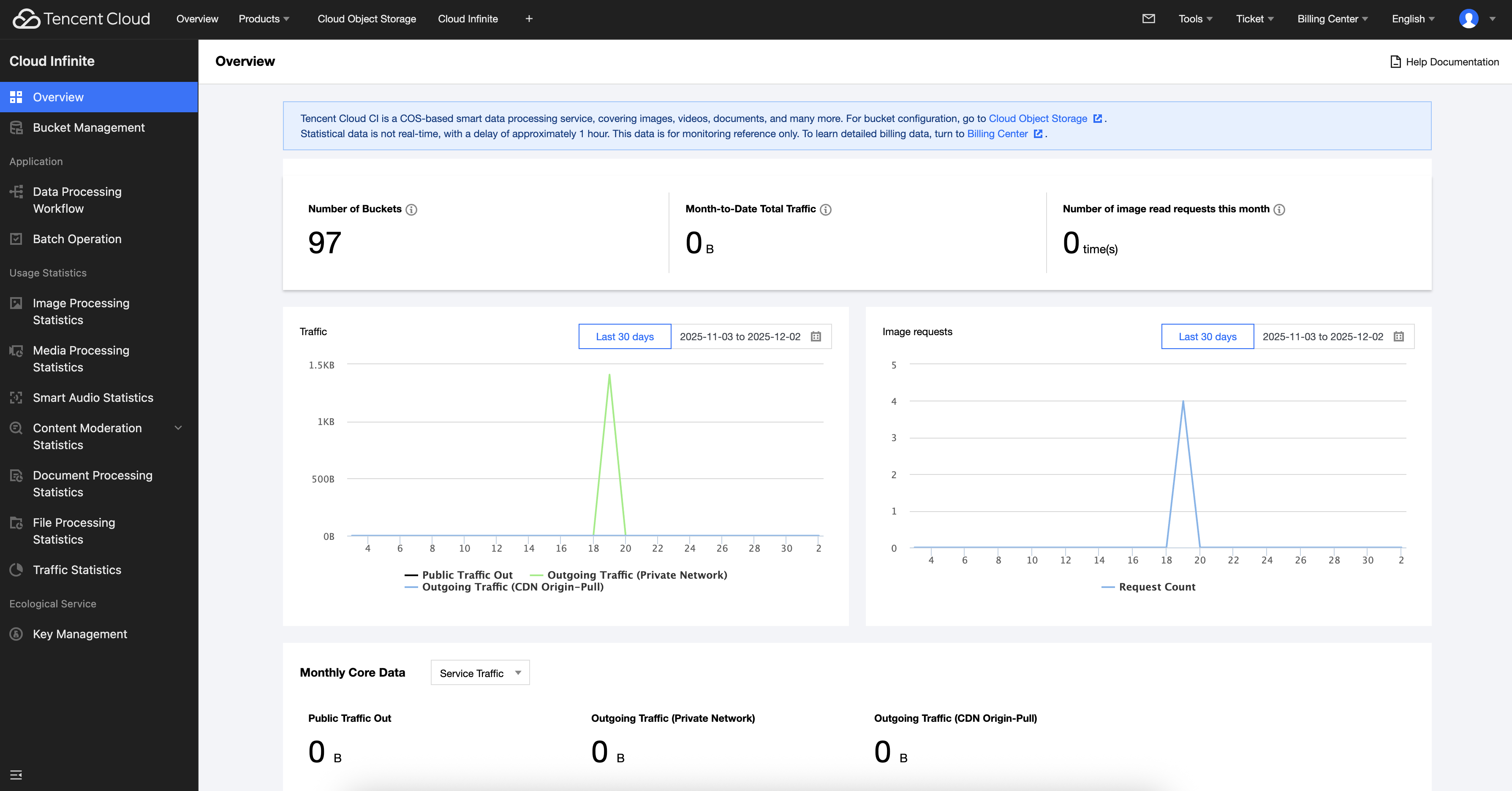 Cloud Infinite usage statistics service provides you with usage data display in multiple dimensions and various ways, currently providing usage statistics for Image Processing, Media Processing, Intelligent Speech, Content Moderation, CR, Document Processing, File Processing, and Traffic.