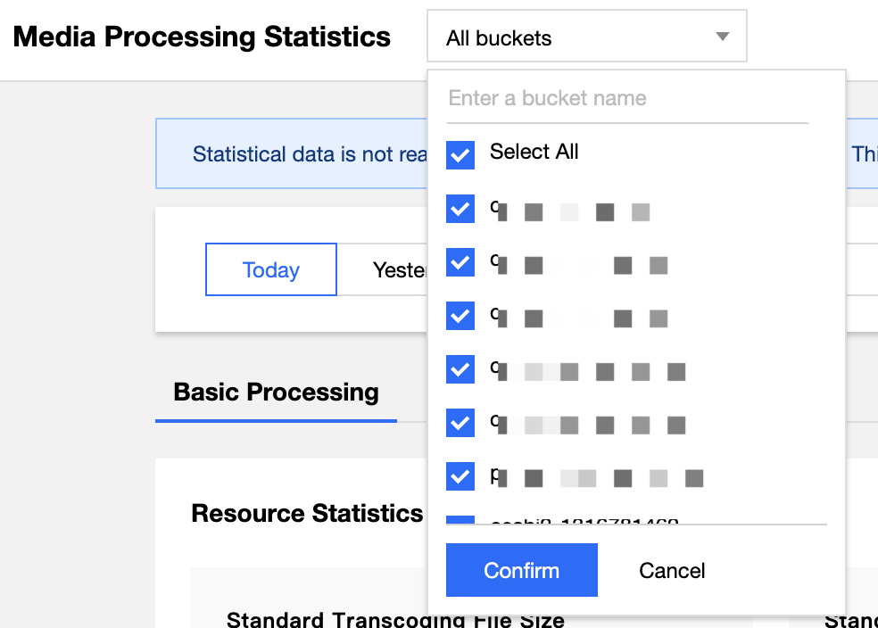 1. Log in to the Cloud Infinite console, select the usage statistics menu list, and click the usage statistics you wish to view. 2. Go to the corresponding usage statistics page, click the dropdown box in the upper left corner, and select the Bucket you wish to view (all Buckets are selected by default).