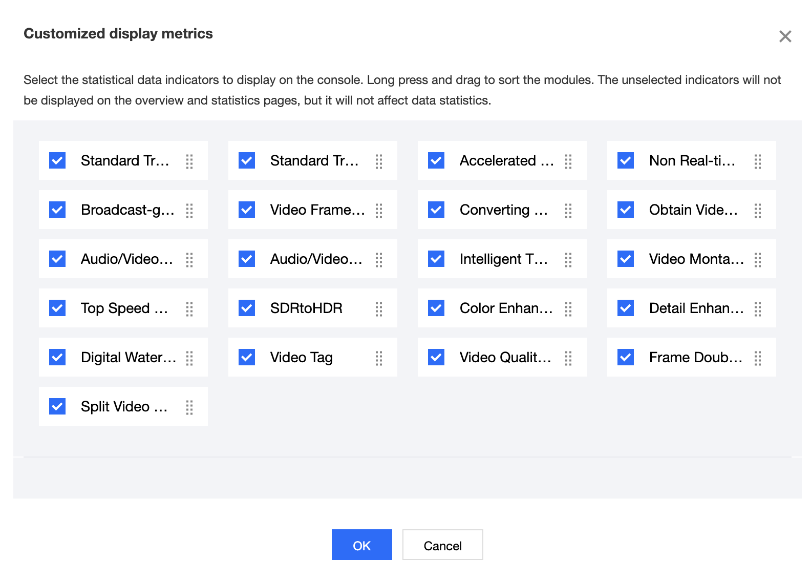 4. Custom Display Metrics, you can select the statistical metrics to display for the current account and statistical category based on your feature usage.