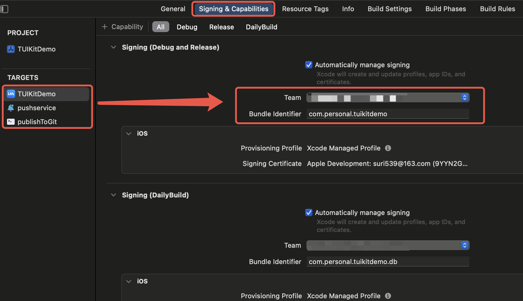 3. In the project TARGETS > Signing & Capabilities section, check Automatically manage signing, then configure your Apple developer account and Bundle Identifier for each Target. If you have not signed in to your Apple ID in Xcode, go to Xcode > Preferences > Accounts to add your developer account or Apple ID.