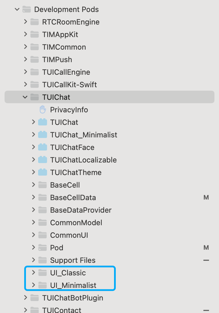 Local Development Pods | Recommended for customizing the source code. | If you use your own git repository, you can track changes. Updating other remote Pod libraries with pod update will not overwrite your customizations. | You must manually update your local TUIKit folder by replacing it with the latest source code. |