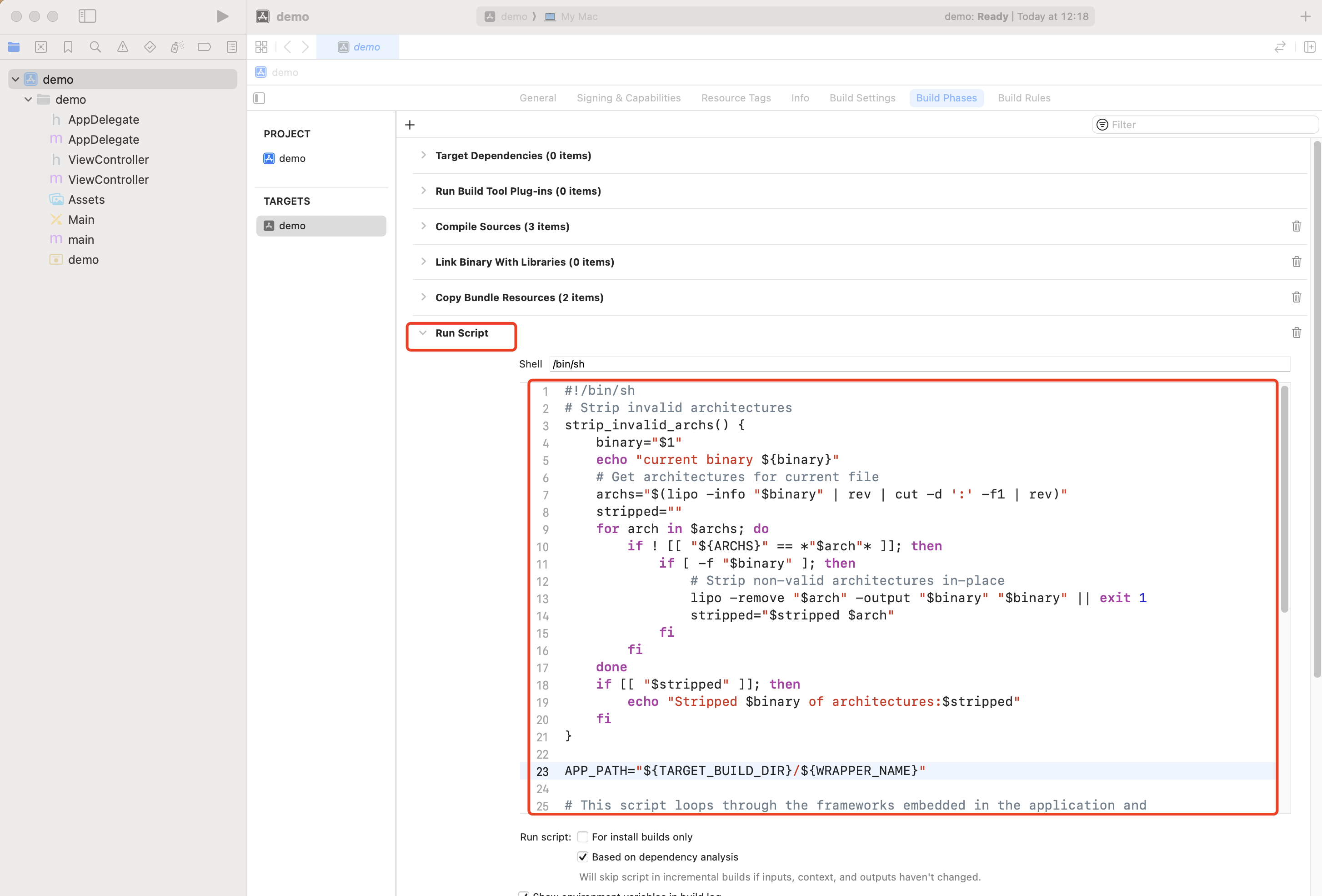 #!/bin/sh# Strip invalid architecturesstrip_invalid_archs() {binary="$1"echo "current binary ${binary}"# Get architectures for current filearchs="$(lipo -info "$binary" | rev | cut -d ':' -f1 | rev)"stripped=""for arch in $archs; doif ! [[ "${ARCHS}" == *"$arch"* ]]; thenif [ -f "$binary" ]; then# Strip non-valid architectures in-placelipo -remove "$arch" -output "$binary" "$binary" || exit 1stripped="$stripped $arch"fifidoneif [[ "$stripped" ]]; thenecho "Stripped $binary of architectures:$stripped"fi}APP_PATH="${TARGET_BUILD_DIR}/${WRAPPER_NAME}"# This script loops through the frameworks embedded in the application and# removes unused architectures.find "$APP_PATH" -name '*.framework' -type d | while read -r FRAMEWORKdoFRAMEWORK_EXECUTABLE_NAME=$(defaults read "$FRAMEWORK/Info.plist" CFBundleExecutable)FRAMEWORK_EXECUTABLE_PATH="$FRAMEWORK/$FRAMEWORK_EXECUTABLE_NAME"echo "Executable is $FRAMEWORK_EXECUTABLE_PATH"strip_invalid_archs "$FRAMEWORK_EXECUTABLE_PATH"done