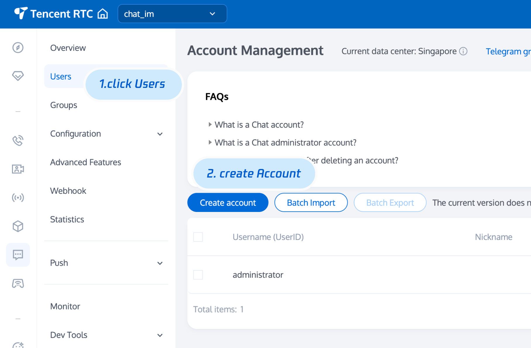 2. Set SDKAPPID and SECRETKEY in the GenerateTestUserSig.js file, which can be obtained from the Chat Console. Click the target application card to enter its configuration page. const SDKAppID = 0;