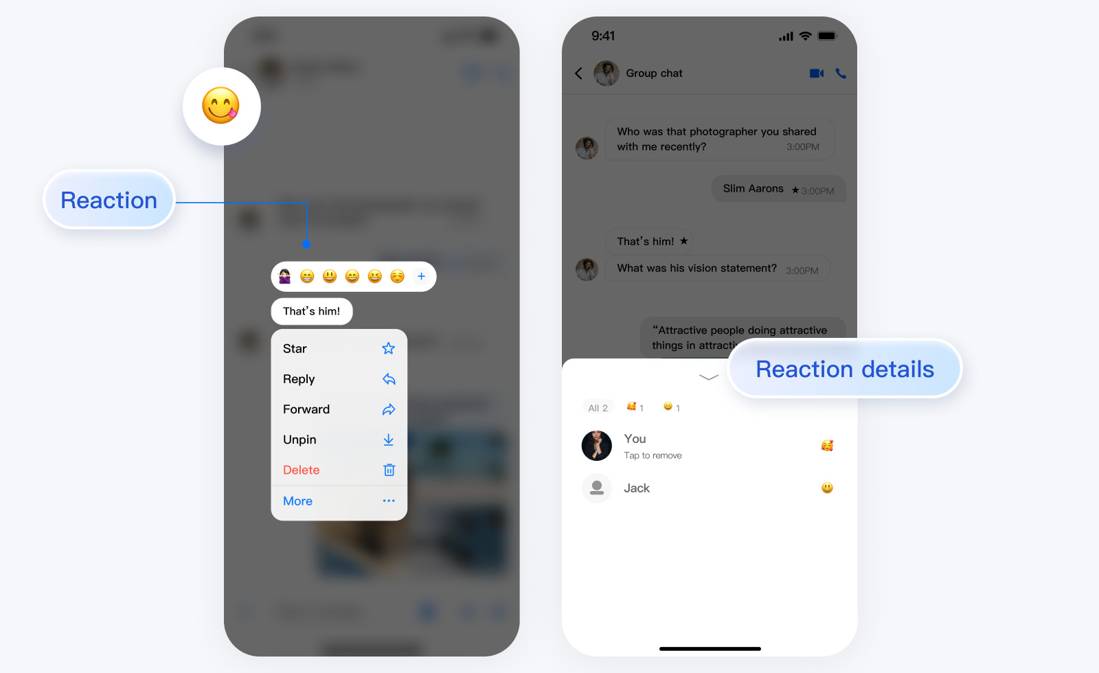 maxUserCountPerReaction | The maximum number of user profiles returned for each Reaction | Value range [0,10], each Reaction returns the profiles of up to the first 10 users only. For more user profiles, You can call the getAllUserListOfMessageReaction interface as needed for pagination retrieval. |