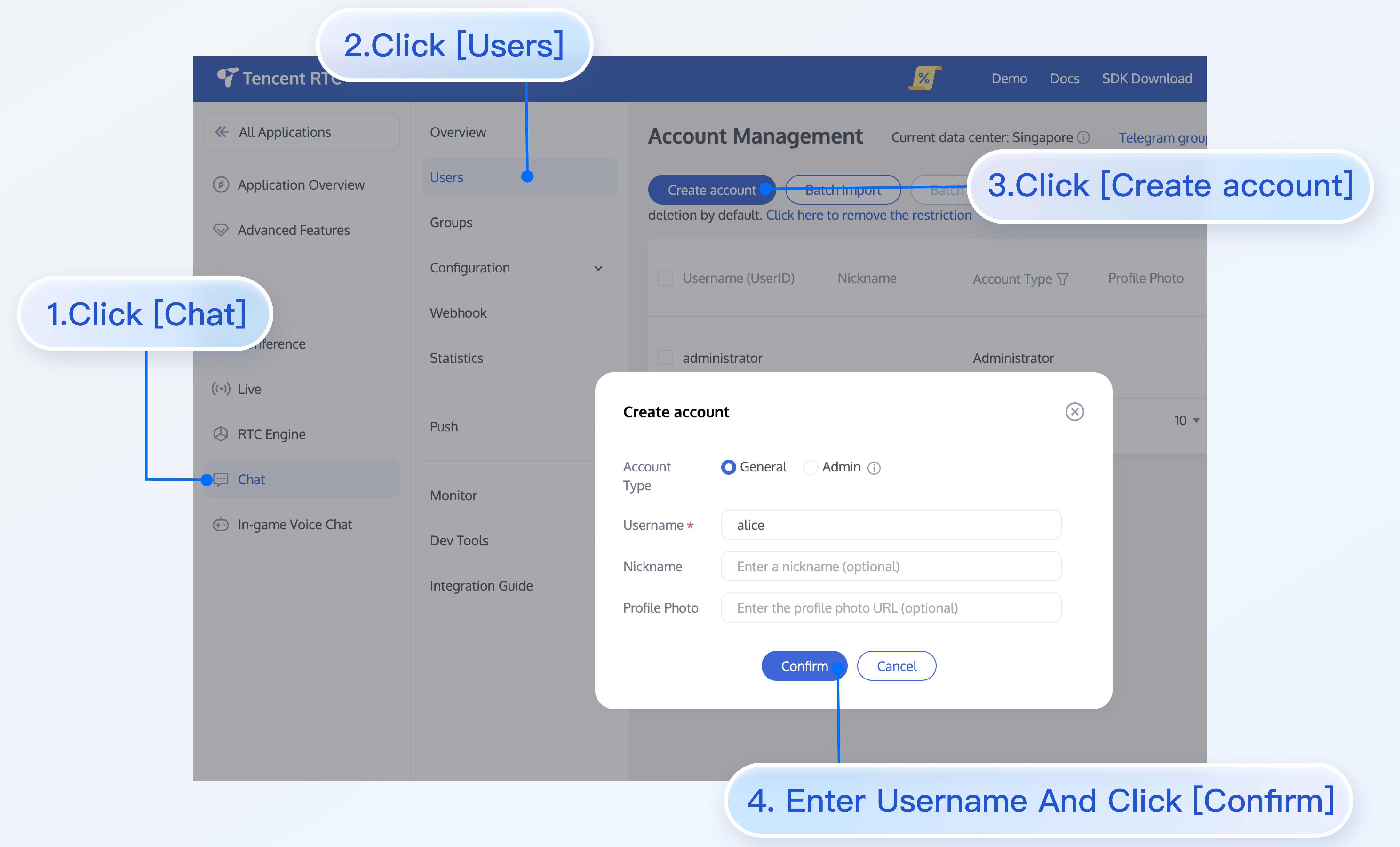userID information. Click Application name of the target Application to enter the account management page and create 2–3 userIDs for future reference to experience the chat feature.