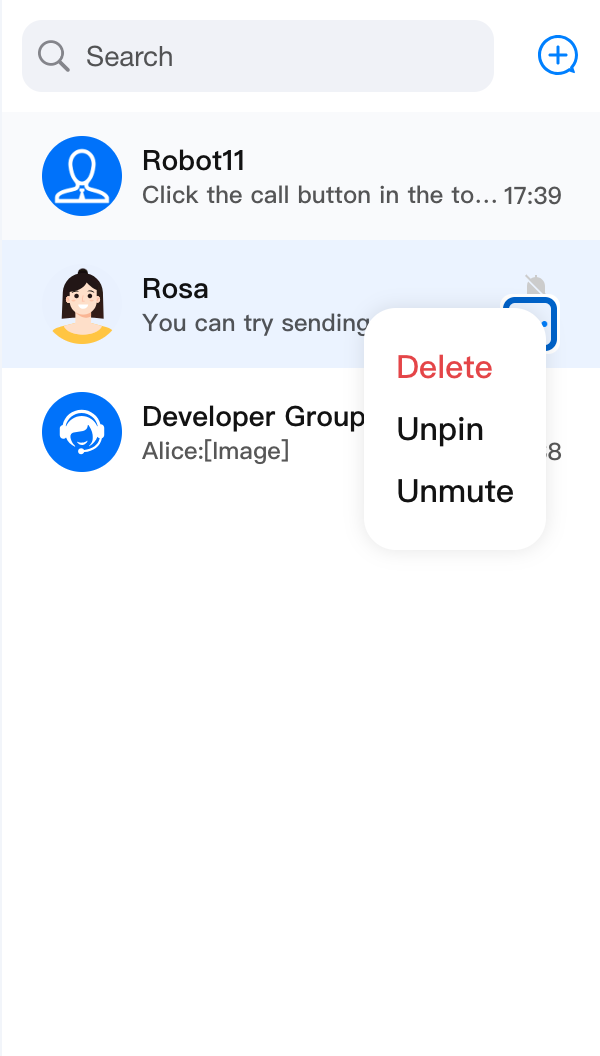 enablePin, enableDelete, and enableMute parameters, you can flexibly control the display of conversation pinning, mute message notification, and conversation deletion in ConversationActions.<ConversationActions enablePin={false} />