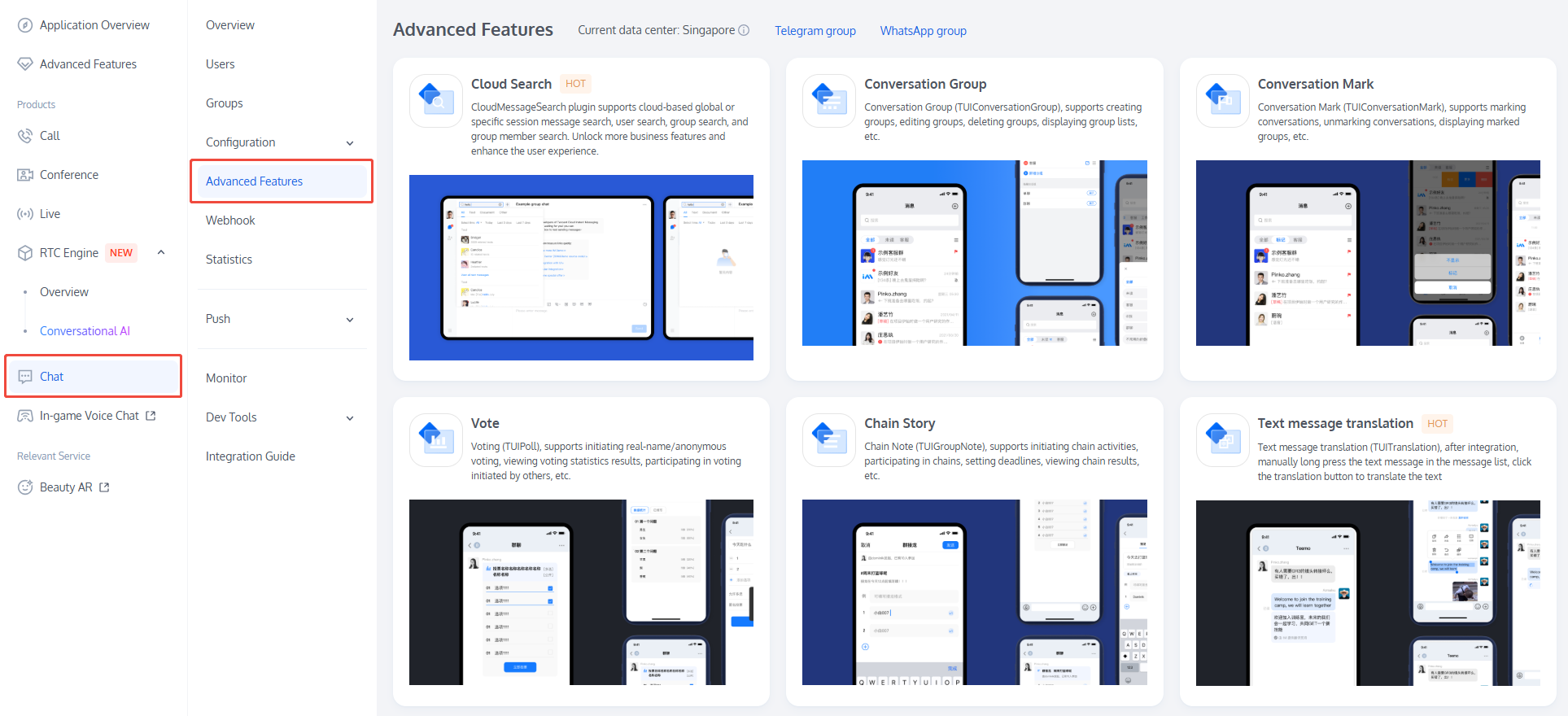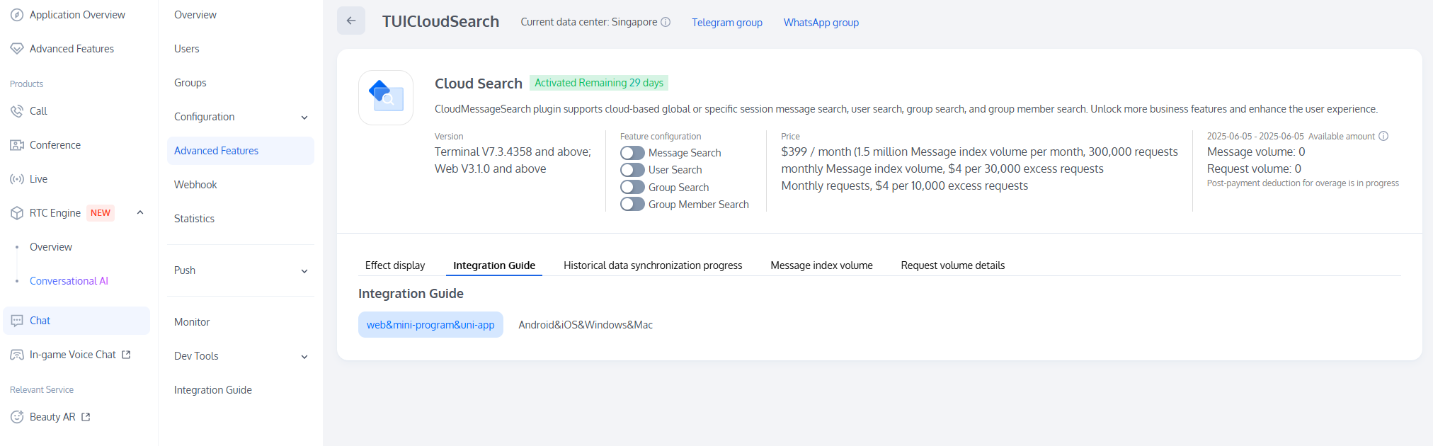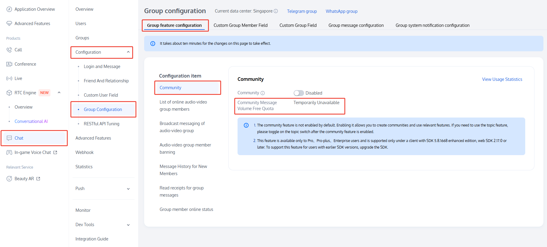 For the community downstream message volume covered by the current Chat Monthly Package, go to the Chat Console, select the target application to enter the application management page, choose Chat > Configuration >Group Configuration in the left sidebar, and view under Group feature configuration > Community.