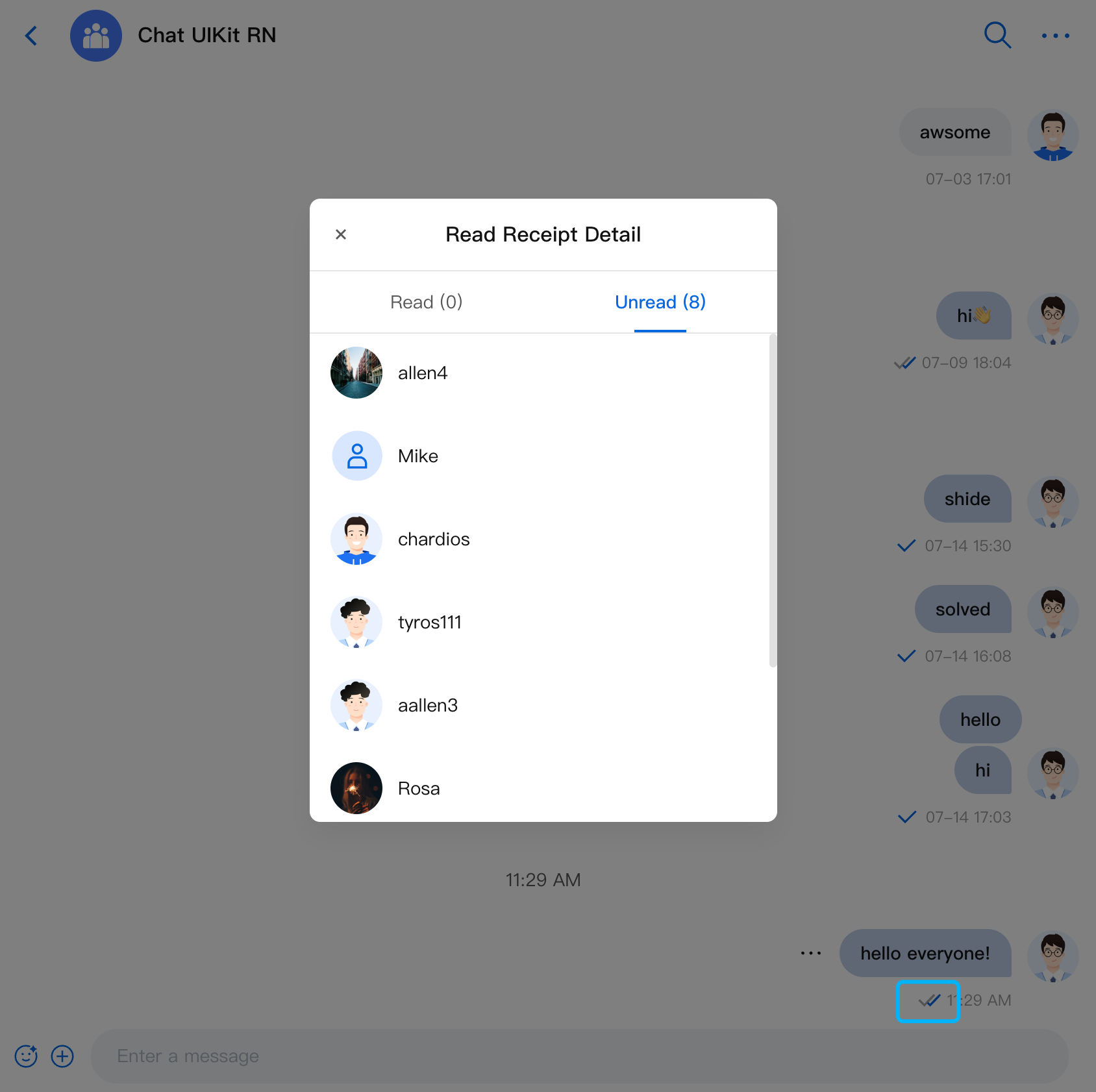 enableReadReceipt property to true in the MessageList component enables read receipt (if left empty, the default value is false).import {Chat,ChatHeader,ConversationList,MessageInput,MessageList,} from '@tencentcloud/chat-uikit-react';function App() {return (<UIKitProvider><div style={{ display: 'flex', height: '100vh' }}><ConversationList style={{ minWidth: '30%' }} /><Chat><ChatHeader />// Enable read receipt<MessageList enableReadReceipt={true} /><MessageInput /></Chat></div></UIKitProvider>);}export default App;