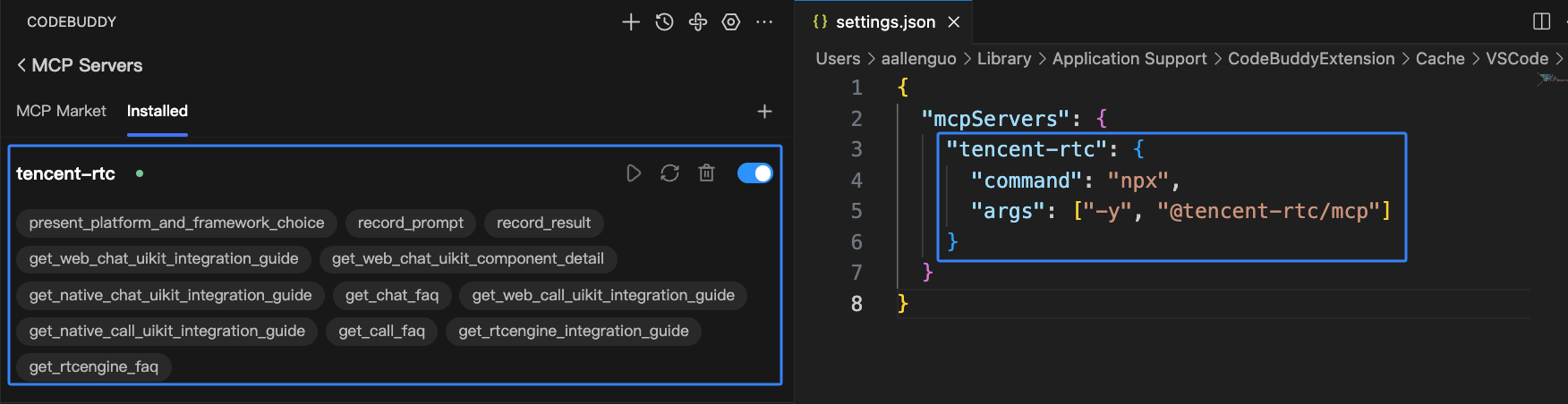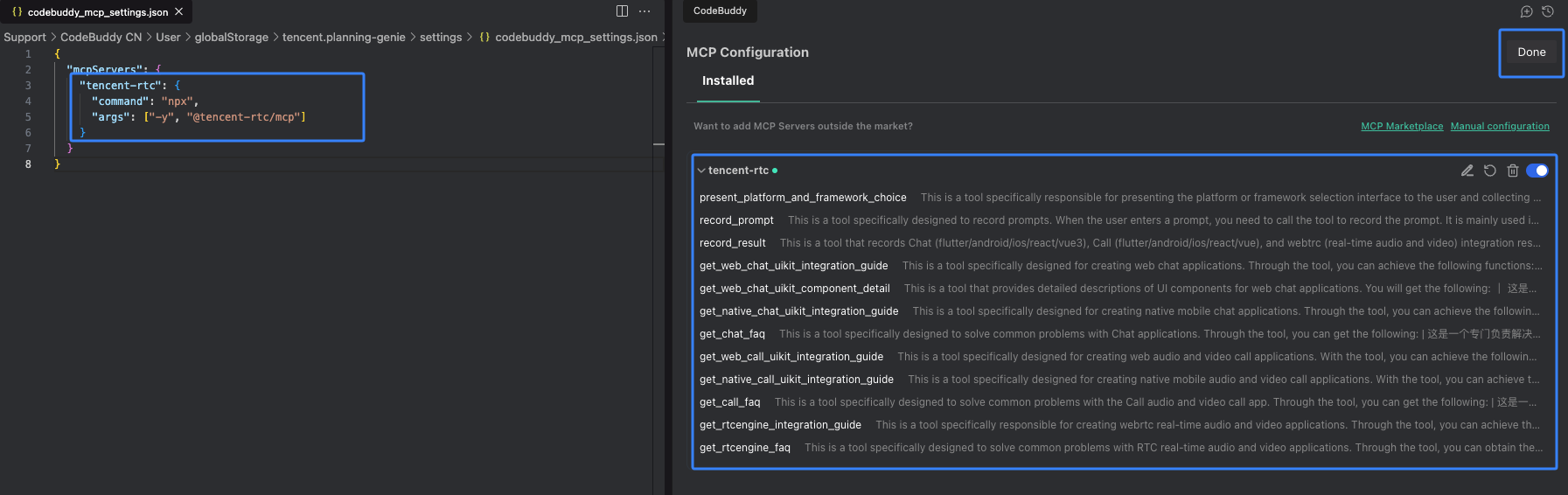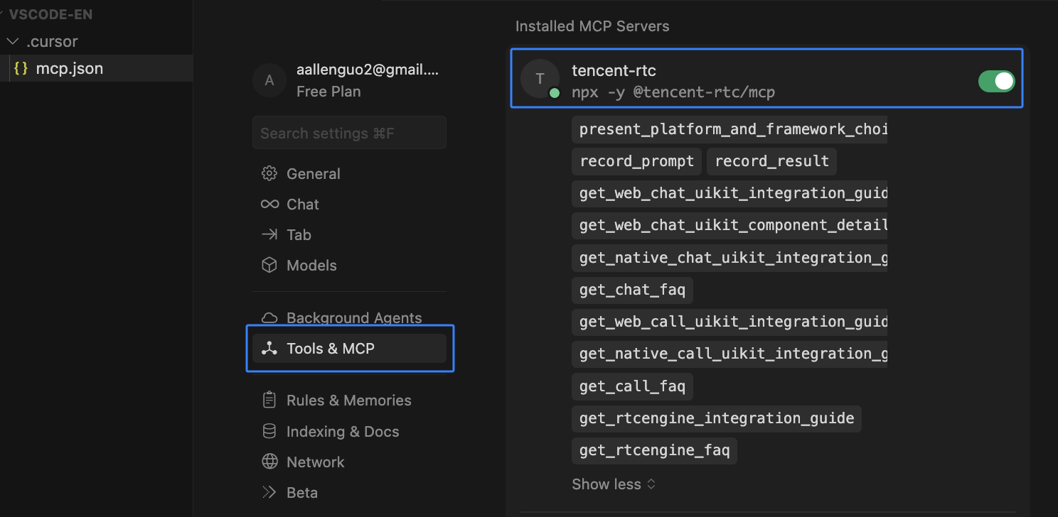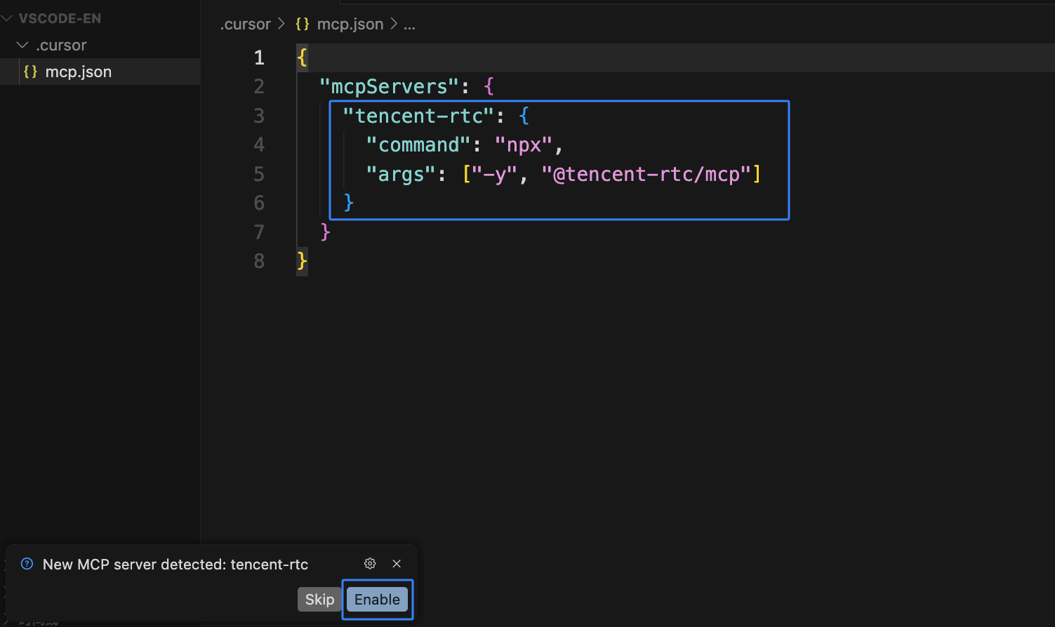 The IDE detects the MCP service via JSON configuration files, which can be set globally or per project for the @tencent-rtc/mcp service. The following provides configuration methods for using MCP in Cursor, CodeBuddy, and VSCode.