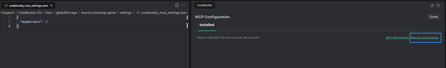 2. Open your project directory with CodeBuddy, click [MCP] -> [Manual Configuration].