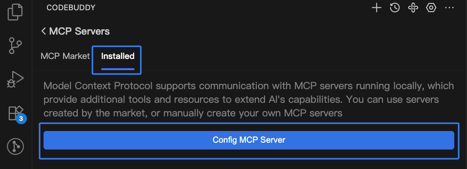 2. Once installed successfully, find the CodeBuddy portal in the sidebar, click [MCP Market] -> [Installed] -> [Configure MCP Server].