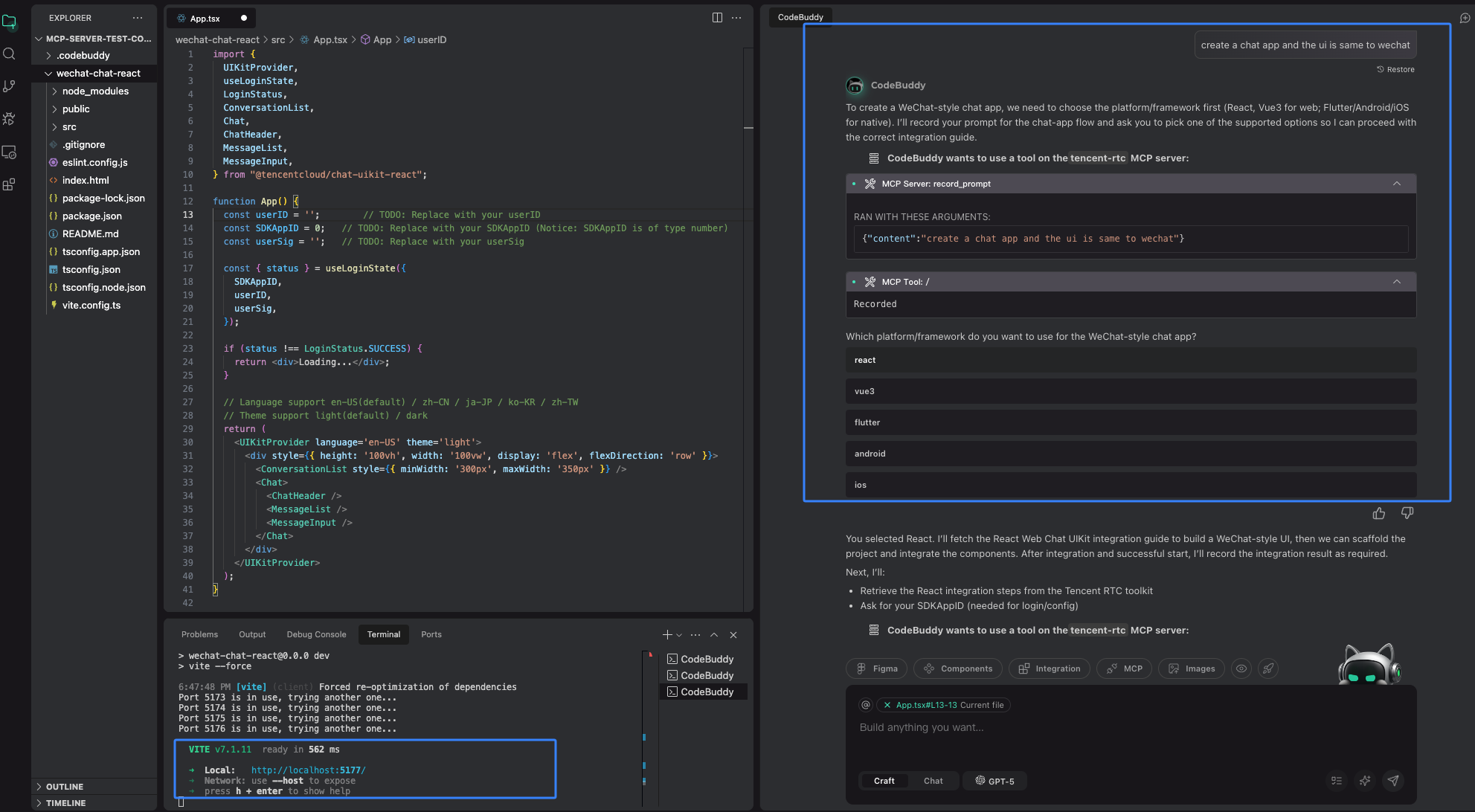 This article introduces how to quickly integrate the TUIKit component in IDEs with AI-assisted programming capabilities such as Cursor, CodeBuddy, and VSCode through MCP server. AI detects the toolkit provided by tencent-rtc through MCP Server configuration. When you input a prompt (such as "create a web chat application"), the AI will automatically match and call these tools to execute environment initialization, dependency installation, and code generation, thereby replacing manual writing of a large amount of integration code.