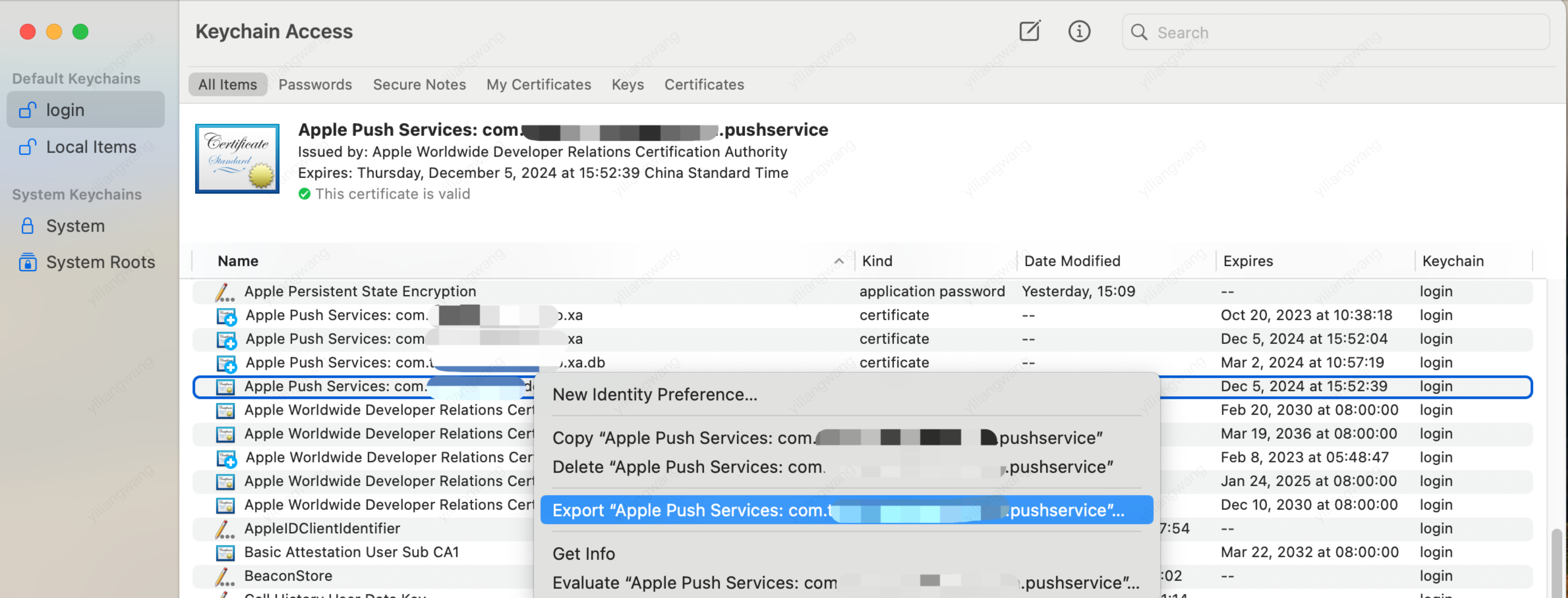 11. Open the keychain access app, go to Login > My Certificates, right-click and export the newly created Apple Development IOS Push Service and Apple Push Services P12 files for development and production environments respectively.