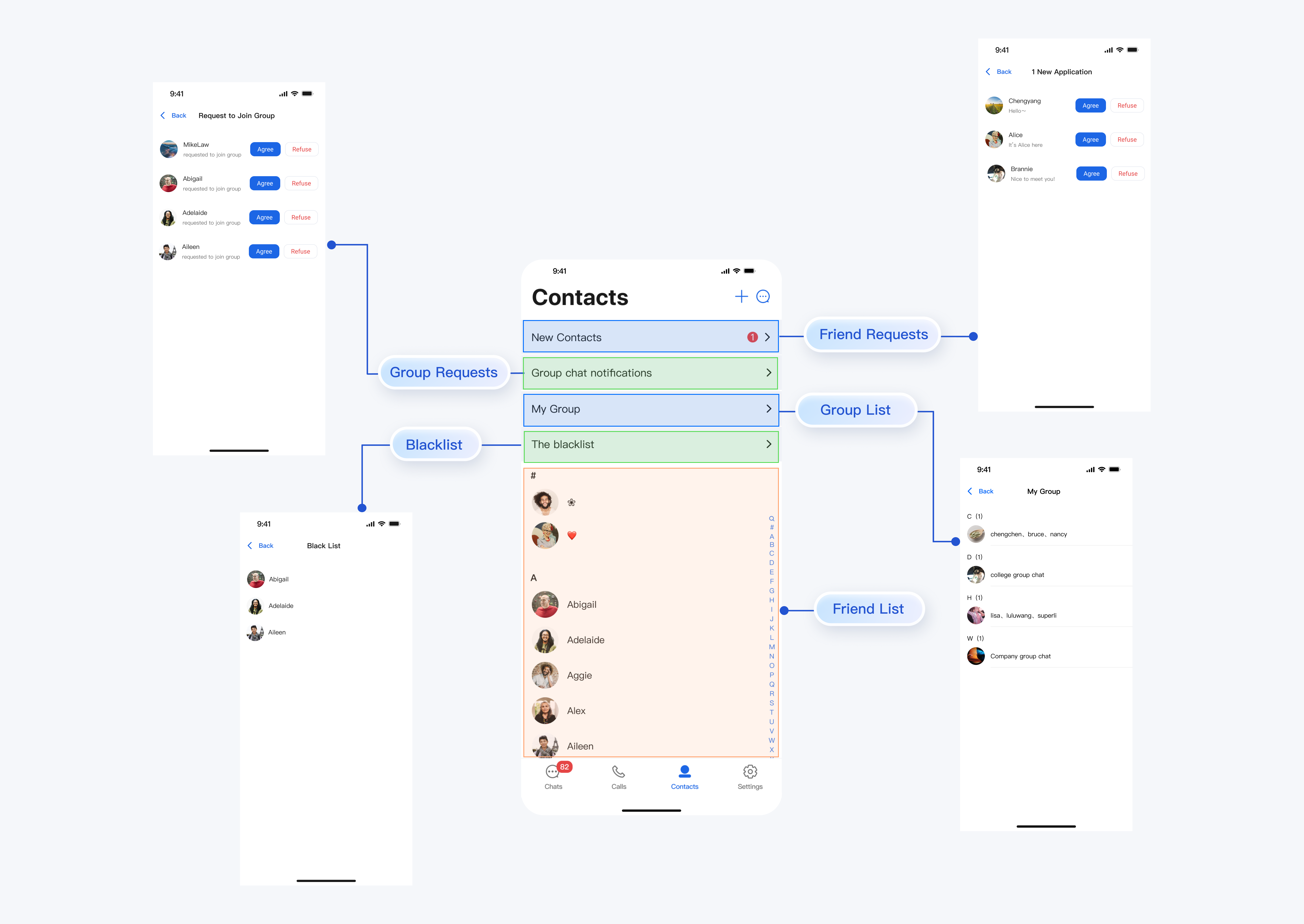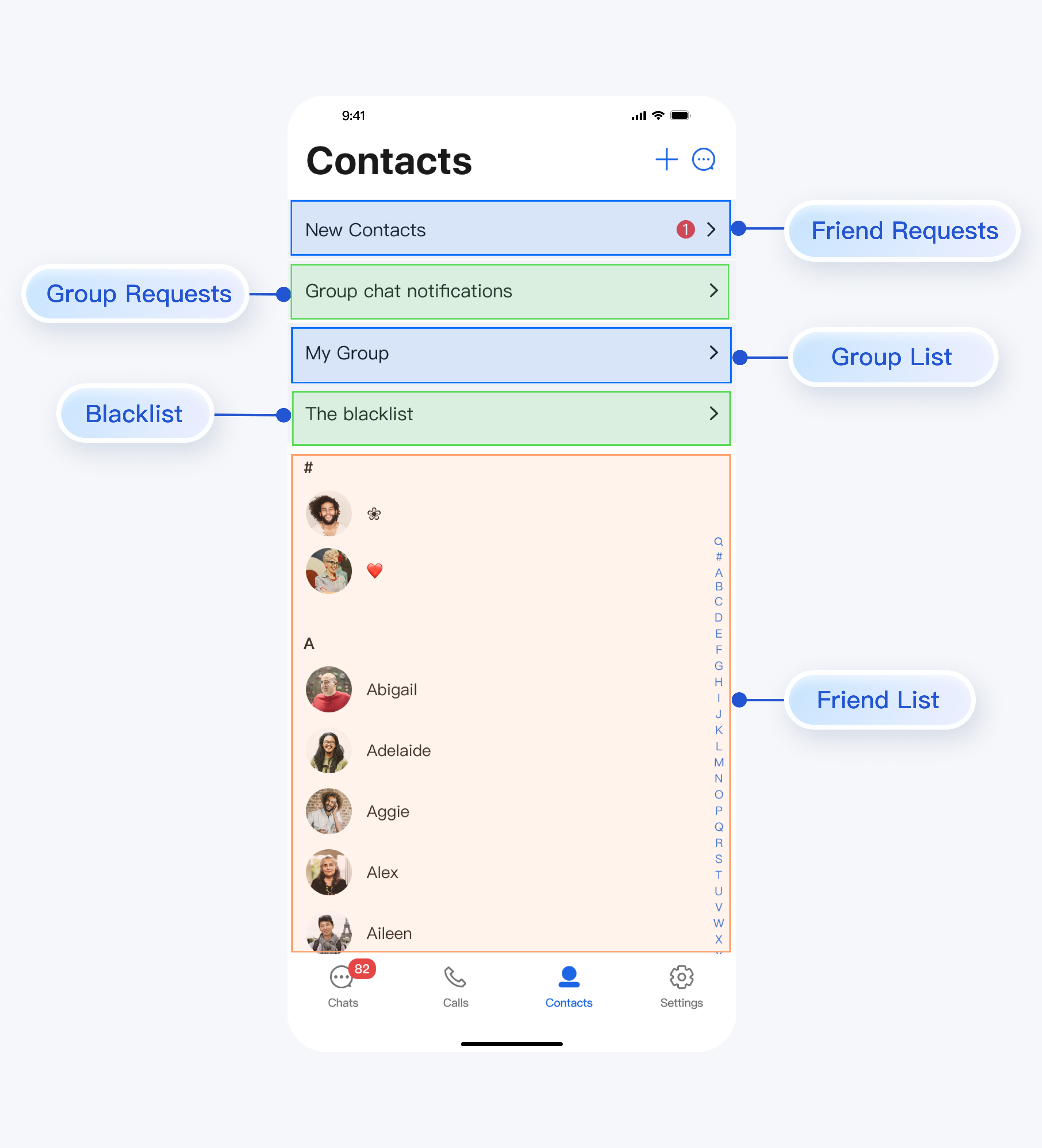 ContactList provides entry points for subviews such as friend requests, group chat requests, group chat list, and blacklist. The bottom section displays the contact list, as shown below: