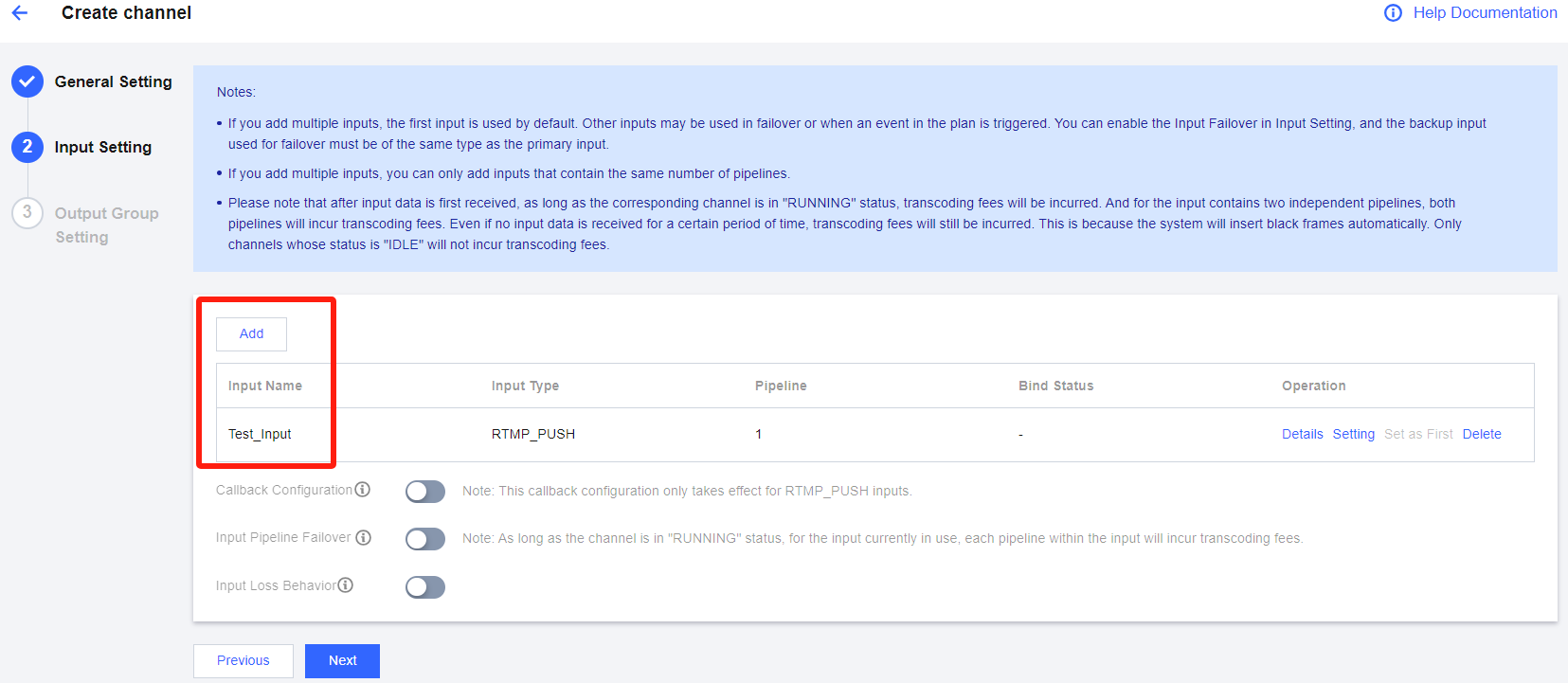5. In the Input Setting step, add the input you just created (you can add multiple inputs, for which you can configure different transcoding templates and outputs).